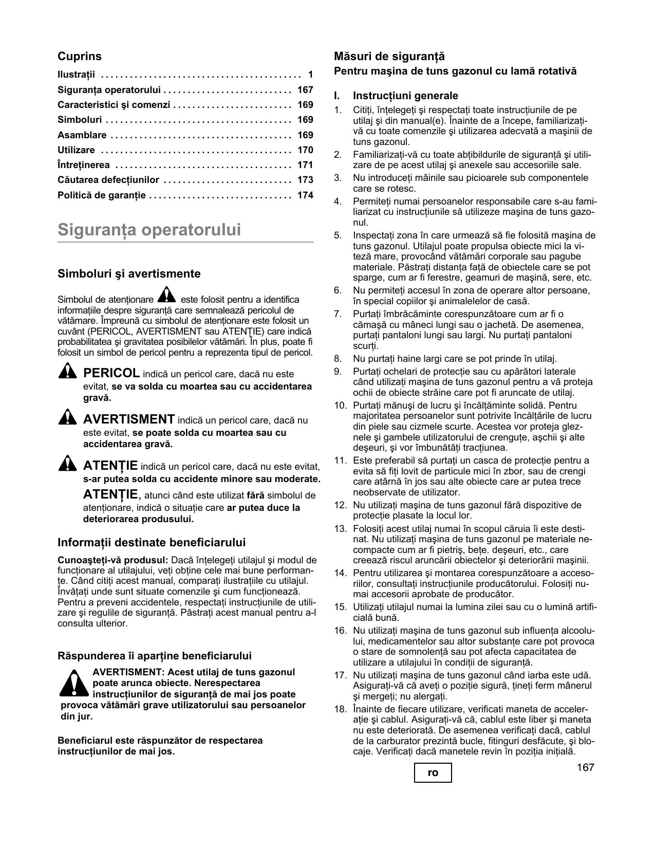 1. Revise el ajuste de altura de cada rueda. El ajuste de altura debe ser el mismo para todas las ruedas. 2. Asegúrese de que la cuchilla esté afilada. 3. Revise si hay alguna cuchilla doblada o quebrada. Las cuchillas dañadas son peligrosas y deben ser reemplazadas. 4. Revise si algún adaptador de la cuchilla está dañado. Reemplace el adaptador dañado de la cuchilla. 5. Mueva el control del acelerador (si el equipo lo tiene) a posición rápida o arranque. 6. Revise el control del acelerador (si el equipo lo tiene). Asegúrese de que el control del acelerador no esté en posición de estrangulación. 7. Mueva el control del acelerador (si el equipo lo tiene) a posición rápida. Revise la velocidad del motor de acuerdo al Manual del Operador del motor. Le symbole d’alerte de sécurité est utilisé pour identifier des informations sur des risques qui peuvent entraîner des blessures. Un mot (DANGER, AVERTISSEMENT, ATTENTION) est utilisé avec le symbole d’alerte pour indiquer le risque de blessure. En outre, un signal de danger peut être utilisé pour représenter le type de risque.