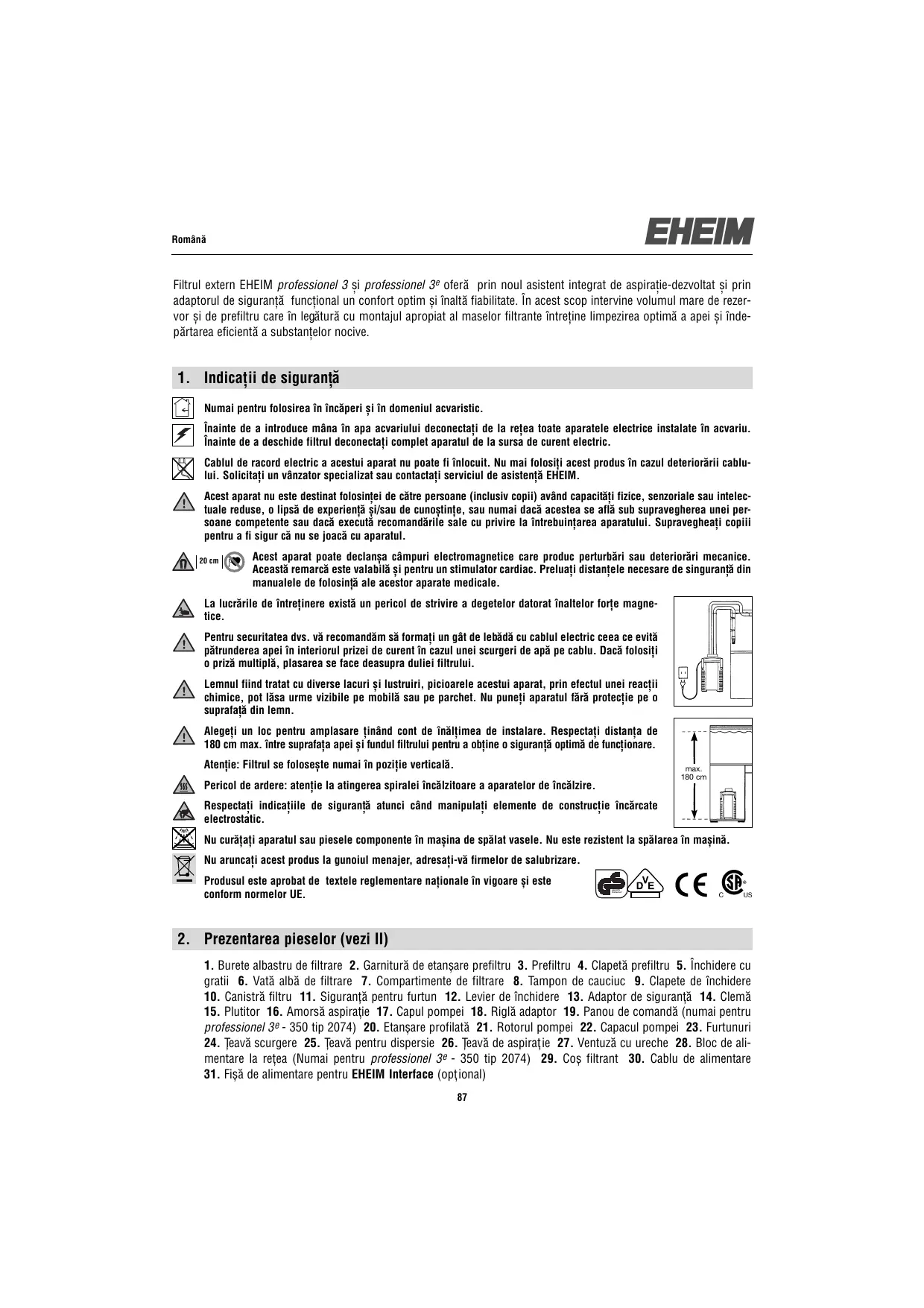 Numai pentru folosirea în încăperi s, i în domeniul acvaristic. Înainte de a introduce mâna în apa acvariului deconectat,i de la ret,ea toate aparatele electrice instalate în acvariu. Înainte de a deschide filtrul deconectat,i complet aparatul de la sursa de curent electric. Cablul de racord electric a acestui aparat nu poate fi înlocuit. Nu mai folosit,i acest produs în cazul deteriorării cablului. Solicitat,i un vânzator specializat sau contactat,i serviciul de asistent,ă EHEIM. Acest aparat nu este destinat folosint,ei de către persoane (inclusiv copii) având capacităt,i fizice, senzoriale sau intelectuale reduse, o lipsă de experient,ă s,i/sau de cunos,tint,e, sau numai dacă acestea se află sub supravegherea unei persoane competente sau dacă execută recomandările sale cu privire la întrebuint,area aparatului. Supravegheat,i copiii pentru a fi sigur că nu se joacă cu aparatul. 20 cm Acest aparat poate declans,a câmpuri electromagnetice care produc perturbări sau deteriorări mecanice. Această remarcă este valabilă s, i pentru un stimulator cardiac. Preluat,i distant,ele necesare de singurant,ă din manualele de folosint,ă ale acestor aparate medicale. La lucrările de întret,inere există un pericol de strivire a degetelor datorat înaltelor fort,e magnetice. Pentru securitatea dvs. vă recomandăm să format,i un gât de lebădă cu cablul electric ceea ce evită pătrunderea apei în interiorul prizei de curent în cazul unei scurgeri de apă pe cablu. Dacă folosit,i o priză multiplă, plasarea se face deasupra duliei filtrului. Lemnul fiind tratat cu diverse lacuri s, i lustruiri, picioarele acestui aparat, prin efectul unei react,ii chimice, pot lăsa urme vizibile pe mobilă sau pe parchet. Nu punet,i aparatul fără protect,ie pe o suprafat,ă din lemn. Aleget,i un loc pentru amplasare ,t inând cont de înălt,imea de instalare. Respectat,i distant,a de 180 cm max. între suprafat,a apei s, i fundul filtrului pentru a obt,ine o sigurant,ă optimă de funct,ionare. Atent,ie: Filtrul se foloses, te numai în pozit,ie verticală. max. 180 cm Pericol de ardere: atent,ie la atingerea spiralei încălzitoare a aparatelor de încălzire. Respectat,i indicat,iile de sigurant,ă atunci când manipulat,i elemente de construct,ie încărcate electrostatic. Nu curăt,at,i aparatul sau piesele componente în mas,ina de spălat vasele. Nu este rezistent la spălarea în mas,ină. Nu aruncat,i acest produs la gunoiul menajer, adresat,i-vă firmelor de salubrizare. Produsul este aprobat de textele reglementare nat,ionale în vigoare s,i este conform normelor UE. geprüfte Sicherheit