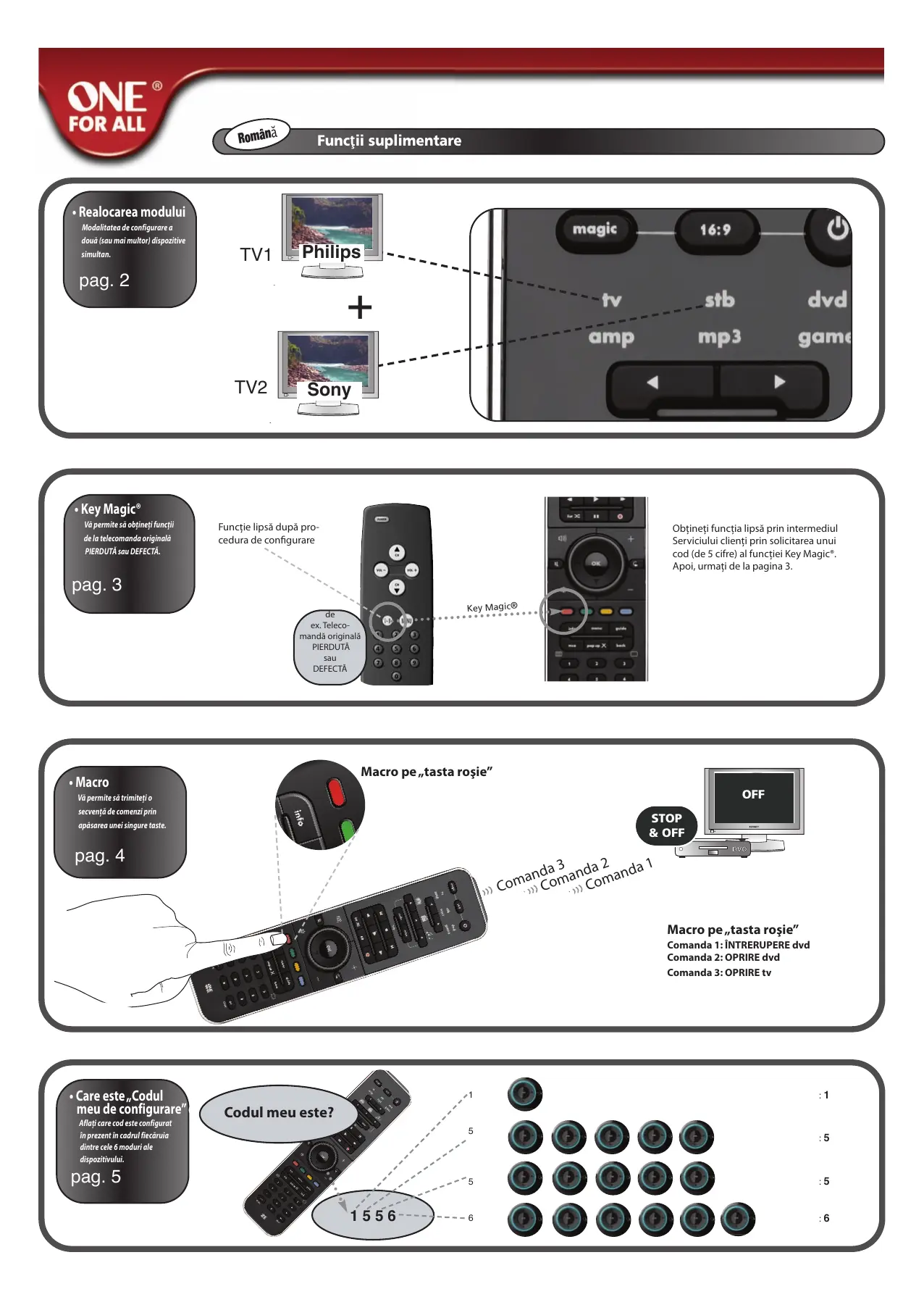 Macro Puteţi programa telecomanda ONE FOR ALL să emită o secvenţă de comenzi în momentul apăsării unei singure taste. Orice secvenţă de comenzi pe care le utilizaţi frecvent poate fi redusă în mod comod la apăsarea unei singure taste. De exemplu, dacă doriţi să creaţi următorul macro: 1-a comandă: dvd --> ÎNTRERUPERE a 2-a comandă: dvd --> DEZACTIVAT a 3-a comandă: tv --> DEZACTIVAT Pentru a configura secvenţa Macro menţionată mai sus de ex. pe tasta „roşie” de pe telecomanda ONE FOR ALL: