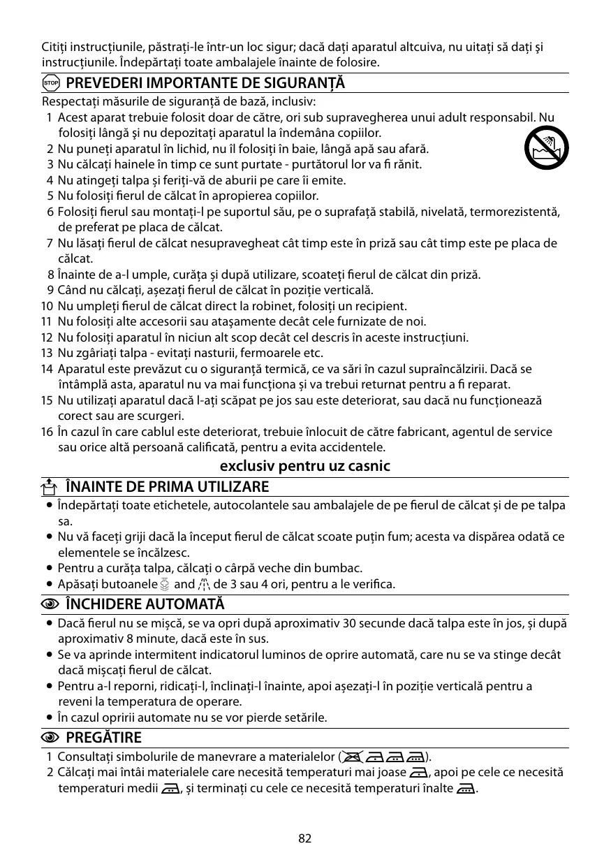 A PREVEDERI IMPORTANTE DE SIGURANŢĂ Respectaţi măsurile de siguranţă de bază, inclusiv: 1 Acest aparat trebuie folosit doar de către, ori sub supravegherea unui adult responsabil. Nu folosiţi lângă şi nu depozitaţi aparatul la îndemâna copiilor. 2 Nu puneţi aparatul în lichid, nu îl folosiţi în baie, lângă apă sau afară. 3 Nu călcați hainele în timp ce sunt purtate - purtătorul lor va fi rănit. 4 Nu atingeți talpa și feriți-vă de aburii pe care îi emite. 5 Nu folosiți fierul de călcat în apropierea copiilor. 6 Folosiți fierul sau montați-l pe suportul său, pe o suprafață stabilă, nivelată, termorezistentă, de preferat pe placa de călcat. 7 Nu lăsați fierul de călcat nesupravegheat cât timp este în priză sau cât timp este pe placa de călcat. 8 Înainte de a-l umple, curăța și după utilizare, scoateți fierul de călcat din priză. 9 Când nu călcați, așezați fierul de călcat în poziție verticală. 10 Nu umpleți fierul de călcat direct la robinet, folosiți un recipient. 11 Nu folosiţi alte accesorii sau ataşamente decât cele furnizate de noi. 12 Nu folosiţi aparatul în niciun alt scop decât cel descris în aceste instrucţiuni. 13 Nu zgâriați talpa - evitați nasturii, fermoarele etc. 14 Aparatul este prevăzut cu o siguranță termică, ce va sări în cazul supraîncălzirii. Dacă se întâmplă asta, aparatul nu va mai funcționa și va trebui returnat pentru a fi reparat. 15 Nu utilizați aparatul dacă l-ați scăpat pe jos sau este deteriorat, sau dacă nu funcționează corect sau are scurgeri. 16 În cazul în care cablul este deteriorat, trebuie înlocuit de către fabricant, agentul de service sau orice altă persoană calificată, pentru a evita accidentele.