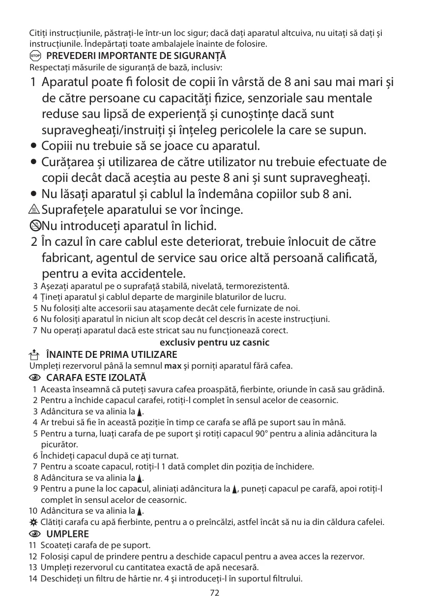 1 Aparatul poate fi folosit de copii în vârstă de 8 ani sau mai mari și de către persoane cu capacități fizice, senzoriale sau mentale reduse sau lipsă de experiență și cunoștințe dacă sunt supravegheați/instruiți și înțeleg pericolele la care se supun. • Copiii nu trebuie să se joace cu aparatul. • Curățarea și utilizarea de către utilizator nu trebuie efectuate de copii decât dacă aceștia au peste 8 ani și sunt supravegheați. • Nu lăsați aparatul și cablul la îndemâna copiilor sub 8 ani. h Suprafețele aparatului se vor încinge. lNu introduceţi aparatul în lichid. 2 În cazul în care cablul este deteriorat, trebuie înlocuit de către fabricant, agentul de service sau orice altă persoană calificată, pentru a evita accidentele. 3 Aşezaţi aparatul pe o suprafaţă stabilă, nivelată, termorezistentă. 4 Ţineţi aparatul şi cablul departe de marginile blaturilor de lucru. 5 Nu folosiţi alte accesorii sau ataşamente decât cele furnizate de noi. 6 Nu folosiţi aparatul în niciun alt scop decât cel descris în aceste instrucţiuni. 7 Nu operaţi aparatul dacă este stricat sau nu funcţionează corect.
