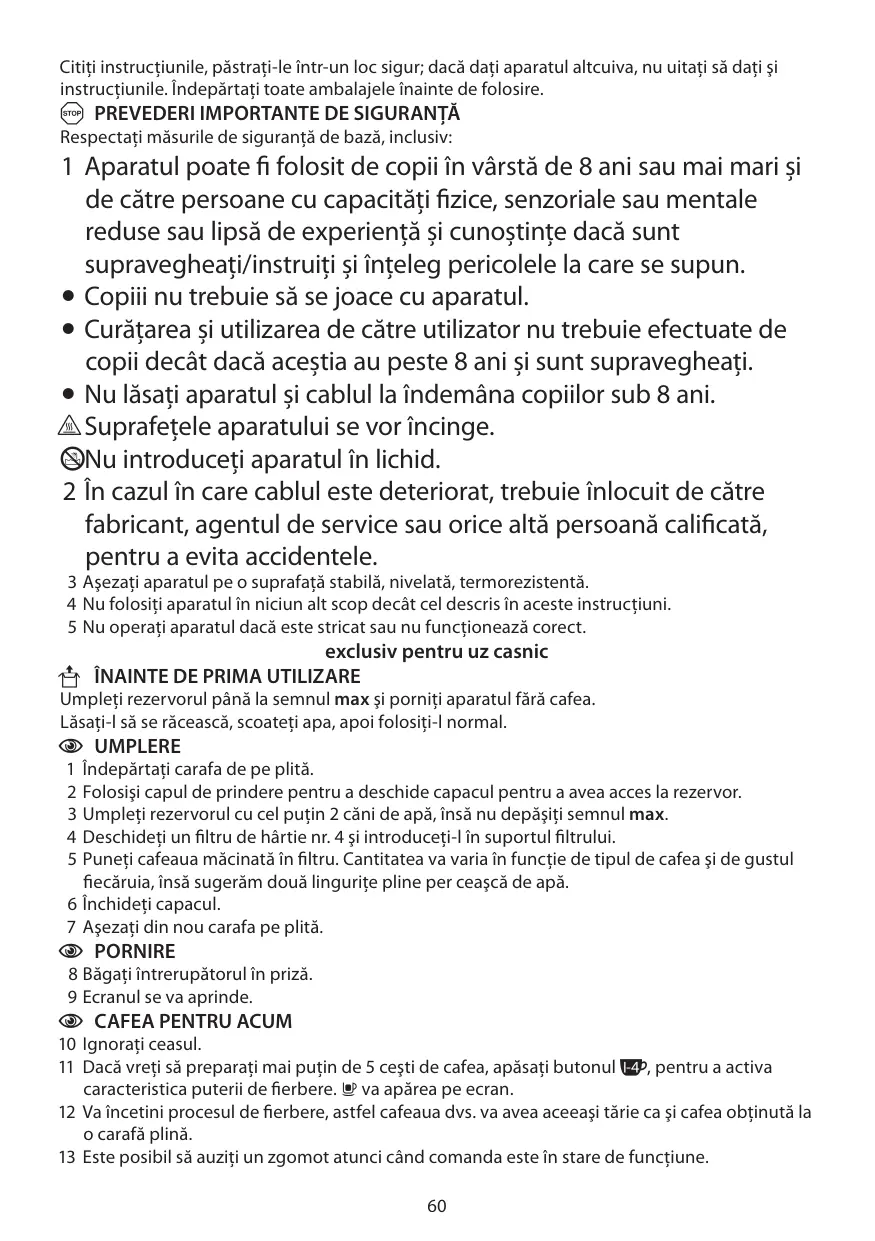 Respectaţi măsurile de siguranţă de bază, inclusiv: 1 Aparatul poate fi folosit de copii în vârstă de 8 ani sau mai mari și de către persoane cu capacități fizice, senzoriale sau mentale reduse sau lipsă de experiență și cunoștințe dacă sunt supravegheați/instruiți și înțeleg pericolele la care se supun.