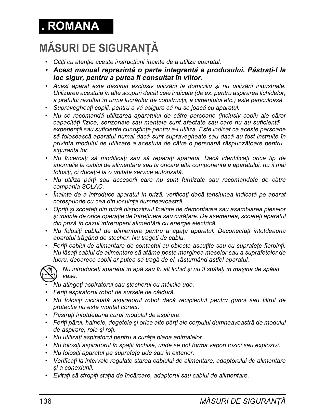 Nu introduce³i aparatul în ap´ sau în alt lichid µi nu îl sp´la³i în maµina de sp´lat vase. Nu atinge³i aspiratorul sau µtecherul cu mâinile ude. Feri³i aspiratorul robot de sursele de c´ldur´. Nu folosi³i niciodat´ aspiratorul robot dac´ recipientul pentru gunoi sau filtrul de protec³ie nu este montat corect. P´stra³i întotdeauna curat modulul de aspirare. Feri³i p´rul, hainele, degetele µi orice alte p´r³i ale corpului dumneavoastr´ de modulul de aspirare, role µi ro³i. Nu utiliza³i aspiratorul pentru a cur´³a blana animalelor. Nu folosi³i aspiratorul în spa³ii închise, unde se pot forma vapori toxici sau explozivi. Nu folosi³i aparatul pe suprafe³e ude sau în exterior. Verifica³i la intervale regulate starea cablului de alimentare, adaptorului de alimentare µi a conexiunii. Evita³i s´ stropi³i sta³ia de înc´rcare, adaptorul sau cablul de alimentare.