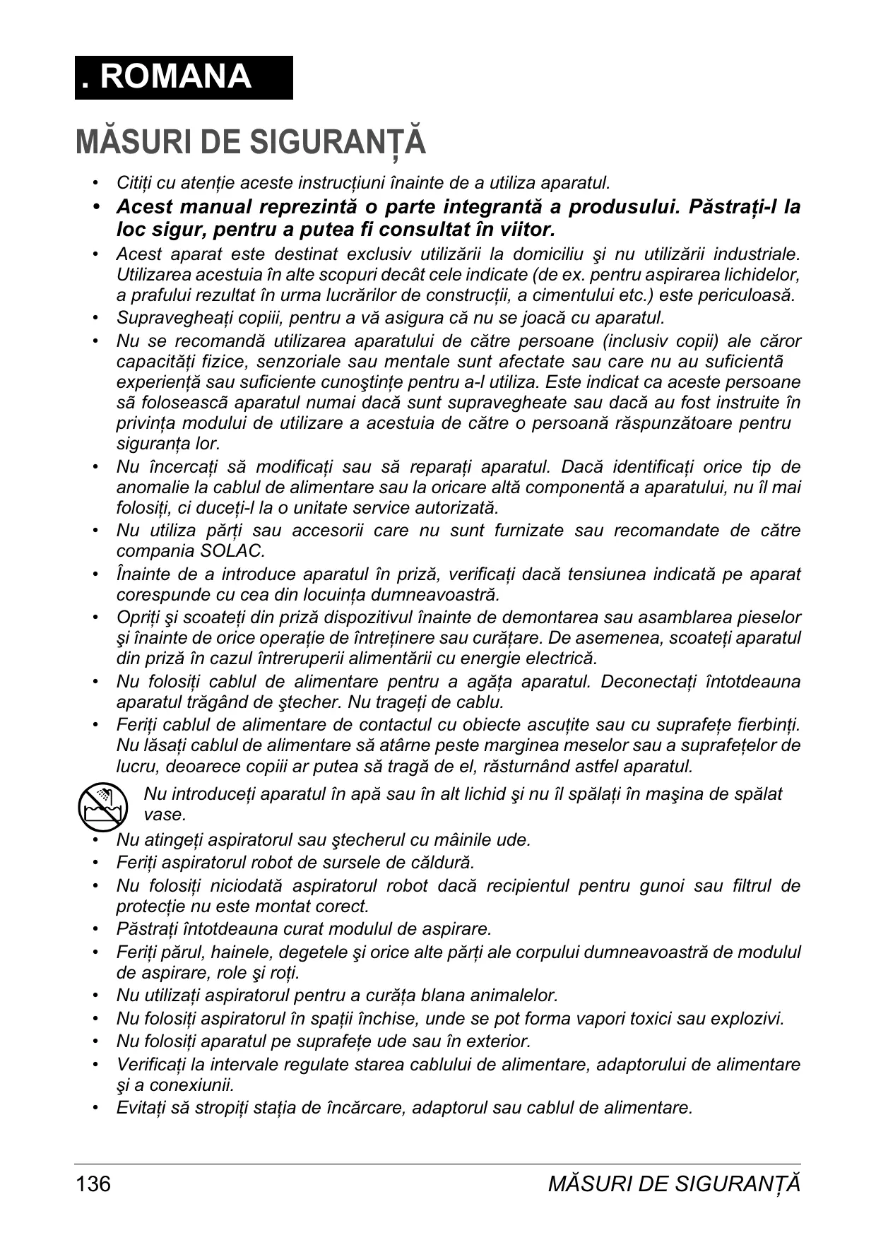 Nu introduce³i aparatul în ap´ sau în alt lichid µi nu îl sp´la³i în maµina de sp´lat vase. Nu atinge³i aspiratorul sau µtecherul cu mâinile ude. Feri³i aspiratorul robot de sursele de c´ldur´. Nu folosi³i niciodat´ aspiratorul robot dac´ recipientul pentru gunoi sau filtrul de protec³ie nu este montat corect. P´stra³i întotdeauna curat modulul de aspirare. Feri³i p´rul, hainele, degetele µi orice alte p´r³i ale corpului dumneavoastr´ de modulul de aspirare, role µi ro³i. Nu utiliza³i aspiratorul pentru a cur´³a blana animalelor. Nu folosi³i aspiratorul în spa³ii închise, unde se pot forma vapori toxici sau explozivi. Nu folosi³i aparatul pe suprafe³e ude sau în exterior. Verifica³i la intervale regulate starea cablului de alimentare, adaptorului de alimentare µi a conexiunii. Evita³i s´ stropi³i sta³ia de înc´rcare, adaptorul sau cablul de alimentare.