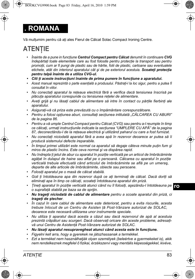 JAMSTVENI UVJETI BOOKCVG9900.book Page 83 Friday, April 16, 2010 1:59 PM . ROMANA Vă mulţumim pentru că aţi ales Fierul de Călcat Solac Compact Ironing Centre. ATENŢIE