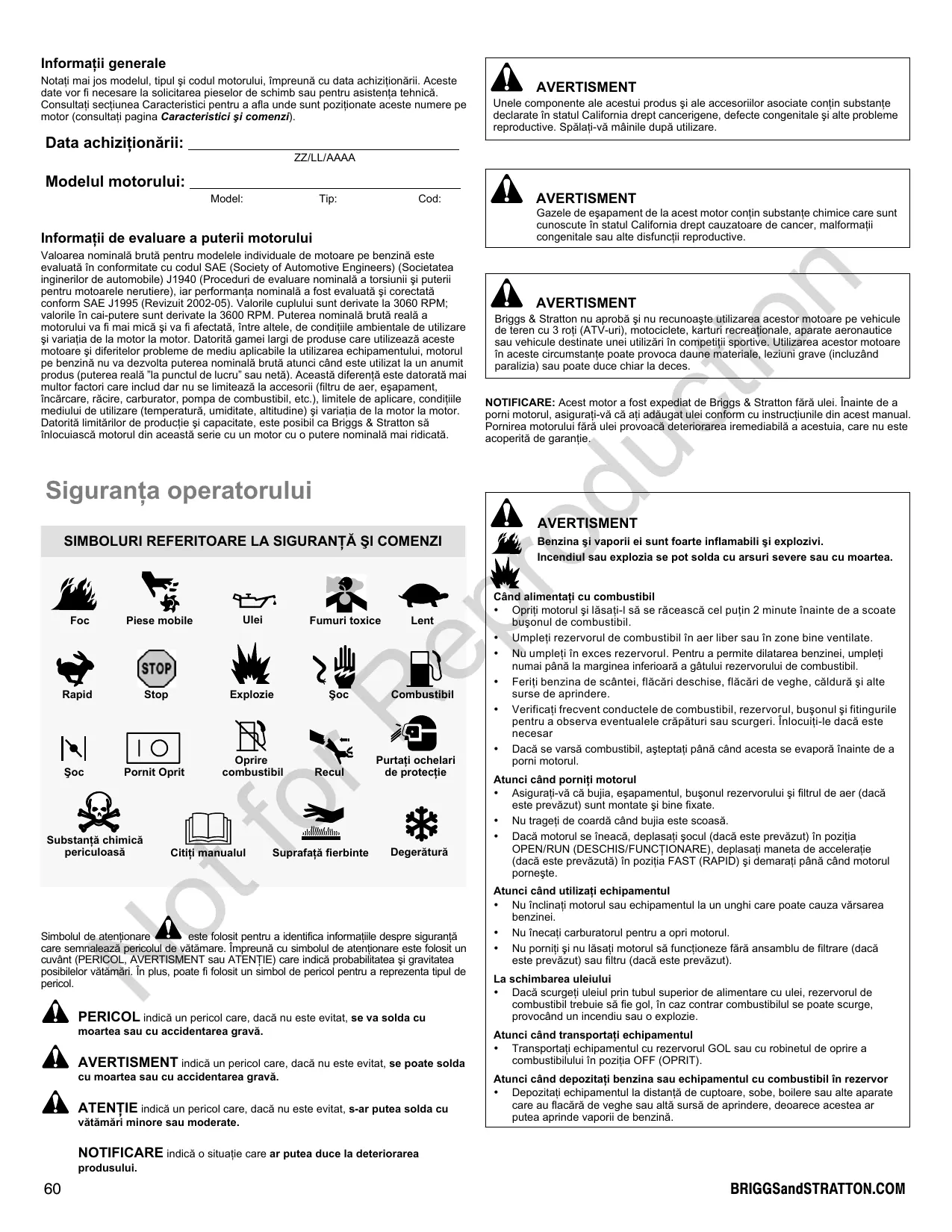 À AVERTISMENT Unele componente ale acestui produs si ale accesorillor asociate contin substante declarate in statul California drept cancerigene, defecte congenitale si alte probleme reproductive. Spälat-vä mâinile dupä utilizare. À AVERTISMENT Gazele de esapament de la acest motor contin substante chimice care sunt cunoscute in statul California drept cauzatoare de cancer, malformatii congenitale sau alte disfuncli reproductive. À AVERTISMENT Briggs & Stratton nu aprobä si nu recunoasteutilizarea acestor motoare pe vehicule de teren cu 3 rofi (ATV-uri), motociclete, karturi recreationale, aparate aeronautice sau vehicule destinate unei utilizäri in competifi sportive. Utlizarea acestor motoare in aceste circumstante poate provoca daune materiale, leziuni grave (incluzänd paralizia) sau poate duce chiar la deces. NOTIFICARE: Acest motor a fost expediat de Briggs & Stratton färä ulei. Inainte de a pomi motorul, asigurati-vä cä afi adäugat ulei conform cu instrucliunile din acest manual Pornirea motorului färà ulei provoacä deteriorarea iremediabilä a acestuia, care nu este acoperitä de garantie. À AVERTISMENT Benzina si vaporii ei sunt foarte inflamabili si explozivi. Incendiul sau explozia se pot solda cu arsuri severe sau cu moartea. Cänd alimentati cu combustibil + Opriti motorul gi läsai-I sä se râceascä cel putin 2 minute inainte de a scoate busonul de combustibil + Umpleti rezervorul de combustibil in aer liber sau in zone bine ventilate. + Nu umpletiîn exces rezervorul. Pentru a permit dilatarea benzinei, umpleti numai pânä la marginea inferioarä a gâtului rezervorului de combustibil. + Feriti benzina de scäntei, fläcäri deschise, fläcäri de veghe, cäldurä gi alte surse de aprindere + Verificati frecvent conductele de combustibil, rezervorul, busonul si fitingurile pentru a observa eventualele cräpäturi sau scurgeri. inlocuiti-le dacä este necesar + Dacä se varsä combustibil, asteptali pânä când acesta se evaporä inainte de a porni motorul. Atunci când pornil motorul Asigurati-vä cà bujia, esapamentul, busonul rezervorului $i filrul de aer (dacä este preväzut) sunt montate $i bine fixate. + Nu tragefi de coardä cänd bujia este scoasä. + Dacä motorul se ineacä, deplasati socul (dacä este preväzut) în pozitia OPEN/RUN (DESCHIS/FUNCTIONARE), deplasati maneta de acceleratie (dacä este preväzutä) in pozitia FAST (RAPID) si demarati pänä când motorul pornegte. Atunci când utilizati echipamentul + Nu inclinafi motorul sau echipamentul la un unghi care poate cauza värsarea benzinei. + Nu inecati carburatorul pentru a opri motorul. + Nu pornifi si nu läsati motorul sä functioneze färä ansamblu de filrare (dacä este preväzut) sau filtru (dacä este preväzut). La schimbarea uleiului + Dacä scurgeti uleiul prin tubul superior de alimentare cu ulei, rezervorul de combustibil trebuie sä fie gol, in caz contrar combustibilul se poate scurge, provocänd un incendiu sau o explozie. Atunci când transportati echipamentul + Transportali echipamentul cu rezervorul GOL sau cu robinetul de oprire a combustibilului in pozitia OFF (OPRIT). Atunci cänd depozitati benzina sau echipamentul cu combustibil in rezervor + Depozitati echipamentul la distantä de cuptoare, sobe, boilere sau alte aparate care au flacärä de veghe sau altä sursä de aprindere, deoarece acestea ar putea aprinde vapori de benzinä. BRIGGSandSTRATTON.COM