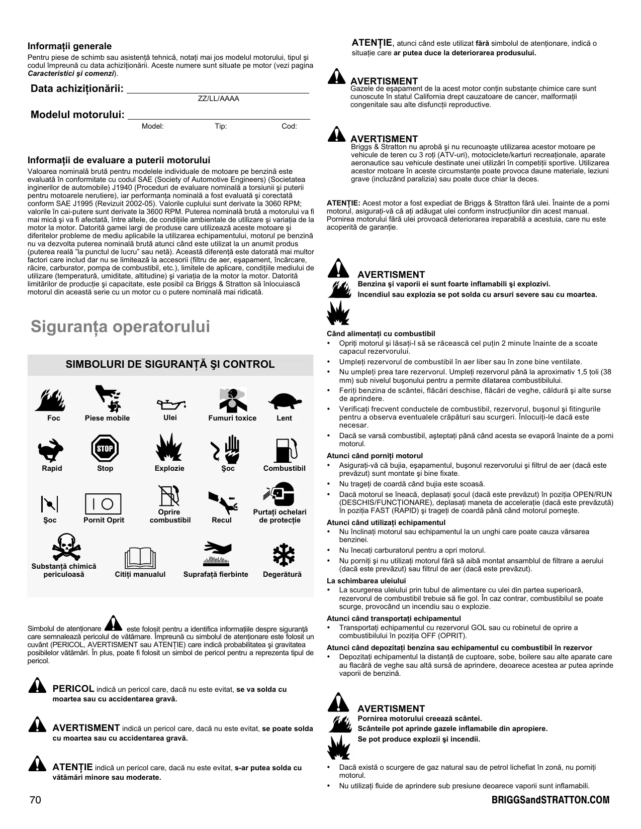 ATENTIE, atunci când este utilizat färä simbolul de atentionare, indicä o situatie care ar putea duce la deteriorarea produsului. À avernisuenr Gazele de esapament de la acest motor contin substante chimice care sunt cunoscute in statul California drept cauzatoare de cancer, malformatii congenitale sau alte disfunci reproductive. À averisuenr Briggs & Stratton nu aprobä si nu recunoaste utilizarea acestor motoare pe vehicule de teren cu 3 rofi (ATV-uri), motociclete/karturi recrealionale, aparate aeronautice sau vehicule destinate unei utilizäri in competiti sportive. Uilizarea acestor motoare in aceste circumstante poate provoca daune materiale, leziuni grave (incluzänd paralizia) sau poate duce chiar la deces. TIE: Acest motor a fost expediat de Briggs & Stratton färä ulei. inainte de a porni motorul, asigurati-vä cà ati adäugat ulei conform instructiunilor din acest manual Pornirea motorului färä ulei provoacä deteriorarea ireparabilä a acestuia, care nu este acoperitä de garantie. À AVERTISMENT Benzina si vaporii ei sunt foarte inflamabili si explozivi. Incendiul sau explozia se pot solda cu arsuri severe sau cu moartea.
