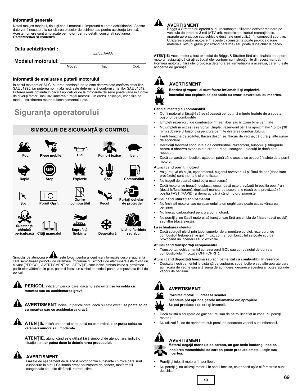 Informatii generale Notali mai jos modelul, tipul gi codul motorului, impreunä cu data achizifionäri. Aceste date vor fi necesare la solicitarea pieselor de schimb sau pentru asistenta tehnicä. Aceste numere sunt amplasate pe motor (pentru detali, consultati secliunea Caracteristici si comenzi). Data achizitionäri ZZILL/AAAA Modelul motorului: Model: Tip: Cod: Informati de evaluare a puterii motorului În cazul motoarelor 3/LC, puterea nominalä brutä este determinatä conform criterilor SAE J1995, iar puterea nominalä netä este determinatä conform criterilor SAE J1349. Puterea realà obfinutä în cadrul aplicatilor de la motoarele de serie poate varia in functie de diversi factori, inclusiv limitarea turatiei motorului in cadrul aplicatiei, conditile de mediu, intrefinerea motorului/echipamentului etc. Siguranta operatorului