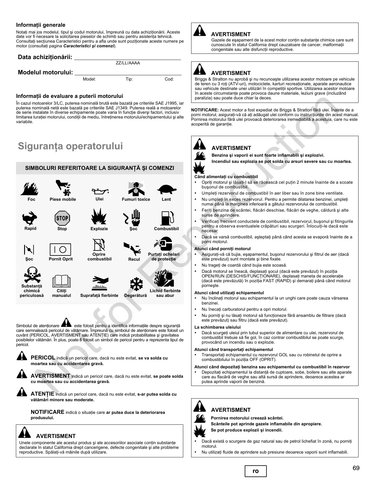 AVERTISMENT indicä un pericol care, dacä nu este evitat, se poate solda cu moartea sau cu accidentarea gravä. ATENTIE indicä un pericol care, dacä nu este evitat, s-ar putea solda cu vätämäri minore sau moderate. NOTIFICARE indicä o situatie care ar putea duce la deteriorarea produsului. À AVERTISMENT Unele component ale acestui produs si ale accesorilor asociate contin substante declarate in statul Califomia drept cancerigene, defecte congenitale si alte probleme reproductive. Spälat-vä mâinile dupä utilizare À AVERTISMENT Gazele de esapament de la acest motor contin substante chimice care sunt cunoscute in statul California drept cauzatoare de cancer, malformatii congenitale sau alte disfuncli reproductive. PIN AVERTISMENT Briggs & Stratton nu aprobä si nu recunoagte utilizarea acestor motoare pe vehicule de teren cu 3 rofi (ATV-uri), motociclete, karturi recreationale, aparate aeronautice sau vehicule destinate unei utilizäri in competifi sportive. Utilizarea acestor motoare in aceste circumstante poate provoca daune material, leziuni grave (incluzänd paralizia) sau poate duce chiar la deces. NOTIFICARE: Acest motor a fost expediat de Briggs & Stratton färä ulei. Inainte de a pomi motorul, asigurati-vä cä afi adäugat ulei conform cu instrucliunile din acest manual Pornirea motorului färà ulei provoacä deteriorarea iremediabilä a acestuia, care nu este acoperitä de garantie. PIN AVERTISMENT Benzina si vaporii ei sunt foarte inflamabili si explozivi. Incendiul sau explozia se pot solda cu arsuri severe sau cu moartea. Cänd alimentati cu combustibil + Opriti motorul gi läsati-I sä se râceascä cel putin 2 minute inainte de a scoate bugonul de combustibil + Umpleti rezervorul de combustibil in aer liber sau in zone bine ventilate. + Nu umpletiin exces rezervorul. Pentru a permite dilatarea benzineï, umpleti numai pânä la marginea inferioarä a gâtului rezervorului de combustibil. + Feriti benzina de scäntei, fläcäri deschise, fläcäri de veghe, cäldurä gi alte surse de aprindere + Verificati frecvent conductele de combustibil, rezervorul, busonul si fitingurile pentru a observa eventualele cräpäturi sau scurgeri. inlocuiti-le dacä este necesar + Dacä se varsä combustibil, agteptati pânä când acesta se evaporä inainte de a porni motorul. Atunci când porniti motorul + Asigurati-vä cä bujia, eçapamentul, bugonul rezervorului $ifltrul de aer (dacä este preväzut) sunt montate $i bine fixate. + Nu trageti de coardä cänd bujia este scoas. + Dacä motorul se ineacä, deplasati socul (dacä este preväzut) în pozitia OPEN/RUN (DESCHIS/FUNCTIONARE), deplasati maneta de acceleratie (dacä este preväzutä) in pozitia FAST (RAPID) si demarati pänä când motorul pornegte. Atunci când utilizati echipamentul + Nu inclinafi motorul sau echipamentul la un unghi care poate cauza värsarea benzinei. + Nu inecati carburatorul pentru a opri motorul. + Nu porniti gi nu läsali motorul sä funcfioneze färä ansamblu de filtrare (dacä este preväzut) sau filtru (dacä este preväzut). La schimbarea uleiului + Dacä scurgeli uleiul prin tubul superior de alimentare cu ulei, rezervorul de combustibil trebuie sà fie gol, in caz contrar combustibilul se poate scurge, provocänd un incendiu sau o explozie: Atunci când transportati echipamentul + Transportali echipamentul cu rezervorul GOL sau cu robinetul de oprire a combustibilului in pozitia OFF (OPRIT). Atunci când depozitati benzina sau echipamentul cu combustibil în rezervor + Depozitali echipamentul la distan{ä de cuptoare, sobe, boilere sau alte aparate care au flacärä de veghe sau altä sursä de aprindere, deoarece acestea ar putea aprinde vaporii de benzinä. AVERTISMENT Pornirea motorului creeazä scäntei. Scänteile pot aprinde gazele inflamabile din apropiere. Se pot produce explozii si incendil. €r> + Dacä existä o scurgere de gaz natural sau de petrol lichefiat in zonà, nu pornifi motorul + Nu utiizafi fluide de aprindere sub presiune deoarece vaporii sunt inflamabil. ro 69