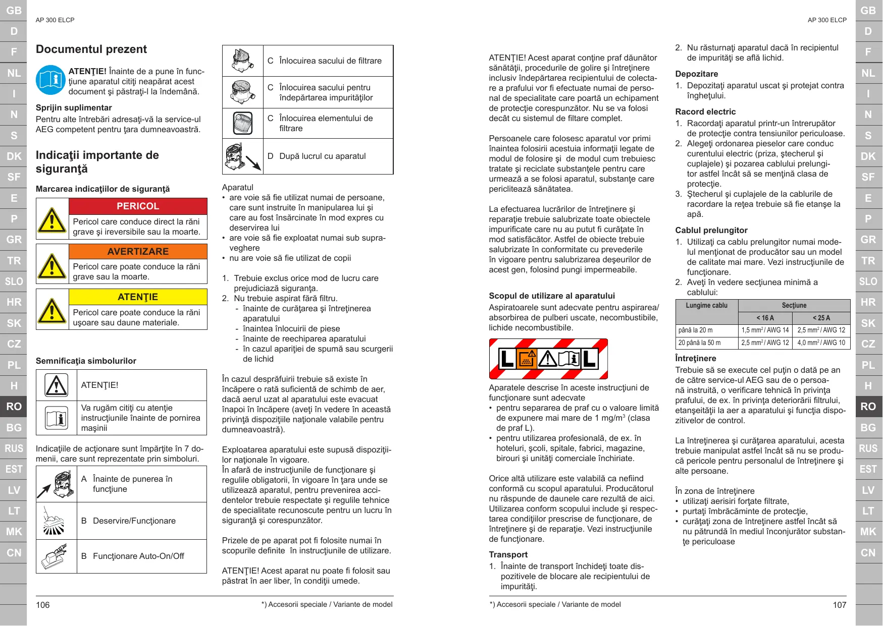 AP 300 ELCP Sprijin suplimentar Pentru alte întrebări adresaţi-vă la service-ul AEG competent pentru ţara dumneavoastră. Indicaţii importante de siguranţă Marcarea indicaţiilor de siguranţă PERICOL