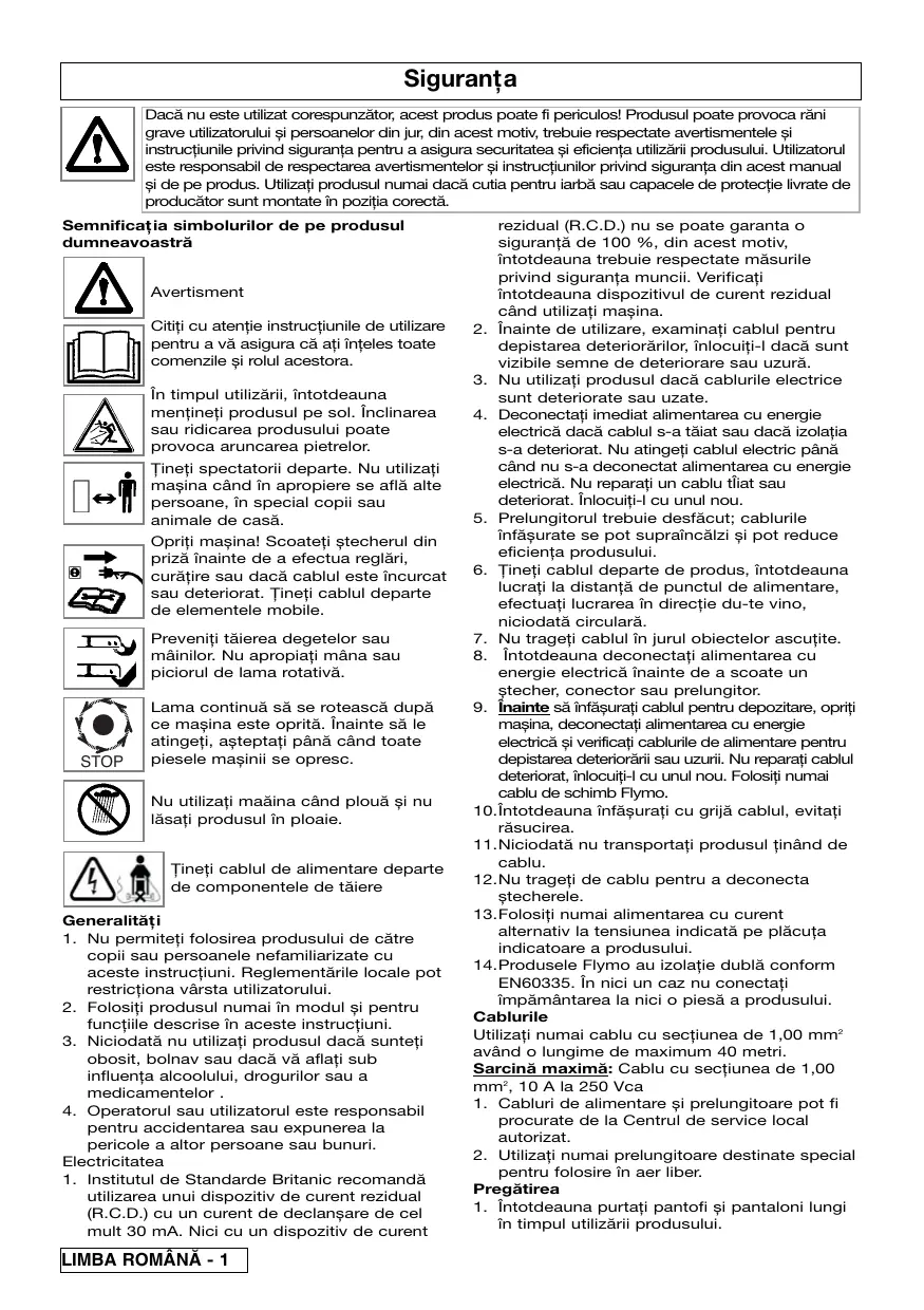 mașina, deconectaţi alimentarea cu energie electrică și verificaţi cablurile de alimentare pentru depistarea deteriorării sau uzurii. Nu reparaţi cablul deteriorat, înlocuiţi-l cu unul nou. Folosiţi numai cablu de schimb Flymo. 10.Întotdeauna înfășuraţi cu grijă cablul, evitaţi răsucirea. 11.Niciodată nu transportaţi produsul ţinând de cablu. 12.Nu trageţi de cablu pentru a deconecta ștecherele. 13.Folosiţi numai alimentarea cu curent alternativ la tensiunea indicată pe plăcuţa indicatoare a produsului. 14.Produsele Flymo au izolaţie dublă conform EN60335. În nici un caz nu conectaţi împământarea la nici o piesă a produsului. Cablurile Utilizaţi numai cablu cu secţiunea de 1,00 mm2 având o lungime de maximum 40 metri. Sarcină maximă: Cablu cu secţiunea de 1,00 mm2, 10 A la 250 Vca