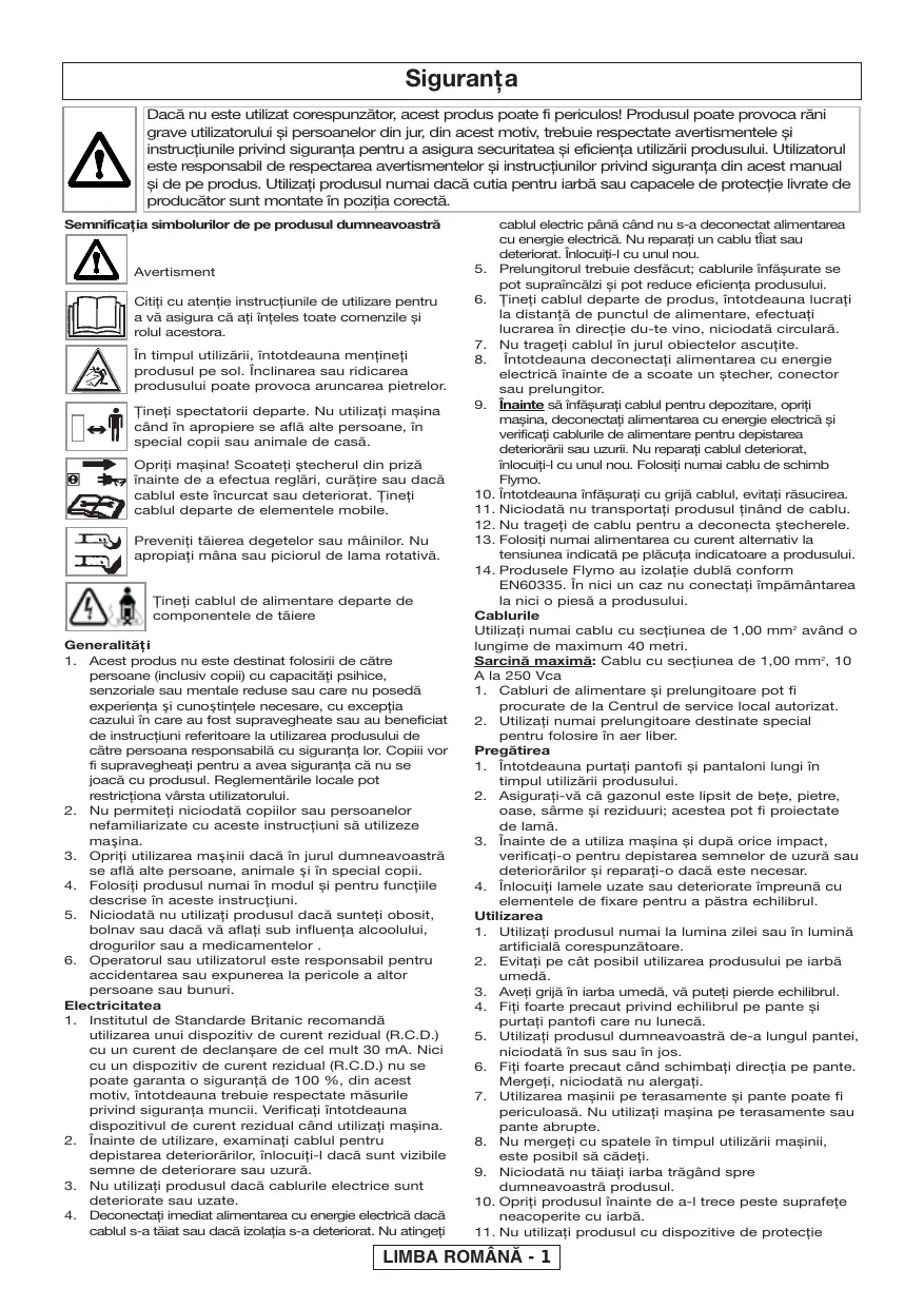 Siguranţa Dacă nu este utilizat corespunzător, acest produs poate fi periculos! Produsul poate provoca răni grave utilizatorului și persoanelor din jur, din acest motiv, trebuie respectate avertismentele și instrucţiunile privind siguranţa pentru a asigura securitatea și eficienţa utilizării produsului. Utilizatorul este responsabil de respectarea avertismentelor și instrucţiunilor privind siguranţa din acest manual și de pe produs. Utilizaţi produsul numai dacă cutia pentru iarbă sau capacele de protecţie livrate de producător sunt montate în poziţia corectă. Semnificaţia simbolurilor de pe produsul dumneavoastră Avertisment Citiţi cu atenţie instrucţiunile de utilizare pentru a vă asigura că aţi înţeles toate comenzile și rolul acestora. În timpul utilizării, întotdeauna menţineţi produsul pe sol. Înclinarea sau ridicarea produsului poate provoca aruncarea pietrelor. Ţineţi spectatorii departe. Nu utilizaţi mașina când în apropiere se află alte persoane, în special copii sau animale de casă. Opriţi mașina! Scoateţi ștecherul din priză înainte de a efectua reglări, curăţire sau dacă cablul este încurcat sau deteriorat. Ţineţi cablul departe de elementele mobile. Preveniţi tăierea degetelor sau mâinilor. Nu apropiaţi mâna sau piciorul de lama rotativă. Ţineţi cablul de alimentare departe de componentele de tăiere Generalităţi