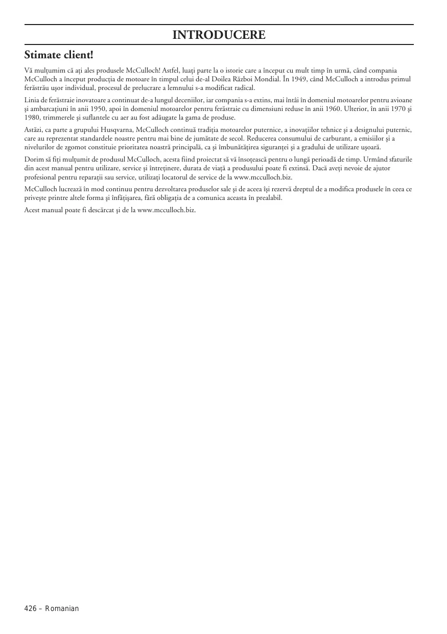 Romanian – 425 INTRODUCERE Stimate client! Vã mulöumim cã aöi ales produsele McCulloch! Astfel, luaöi parte la o istorie care a început cu mult timp în urmã, când compania McCulloch a început producöia de motoare în timpul celui de-al Doilea Rãzboi Mondial. În 1949, când McCulloch a introdus primul ferãstrãu uäor individual, procesul de prelucrare a lemnului s-a modificat radical. Linia de ferãstraie inovatoare a continuat de-a lungul deceniilor, iar compania s-a extins, mai întâi în domeniul motoarelor pentru avioane äi ambarcaöiuni în anii 1950, apoi în domeniul motoarelor pentru ferãstraie cu dimensiuni reduse în anii 1960. Ulterior, în anii 1970 äi 1980, trimmerele äi suflantele cu aer au fost adãugate la gama de produse. Astãzi, ca parte a grupului Husqvarna, McCulloch continuã tradiöia motoarelor puternice, a inovaöiilor tehnice äi a designului puternic, care au reprezentat standardele noastre pentru mai bine de jumãtate de secol. Reducerea consumului de carburant, a emisiilor äi a nivelurilor de zgomot constituie prioritatea noastrã principalã, ca äi îmbunãtãöirea siguranöei äi a gradului de utilizare uäoarã. Dorim sã fiöi mulöumit de produsul McCulloch, acesta fiind proiectat sã vã însoöeascã pentru o lungã perioadã de timp. Urmând sfaturile din acest manual pentru utilizare, service äi întreöinere, durata de viaöã a produsului poate fi extinsã. Dacã aveöi nevoie de ajutor profesional pentru reparaöii sau service, utilizaöi locatorul de service de la www.mcculloch.biz. McCulloch lucreazã în mod continuu pentru dezvoltarea produselor sale äi de aceea îäi rezervã dreptul de a modifica produsele în ceea ce priveäte printre altele forma äi înfãöiäarea, fãrã obligaöia de a comunica aceasta în prealabil. Acest manual poate fi descãrcat äi de la www.mcculloch.biz. 426 – Romanian