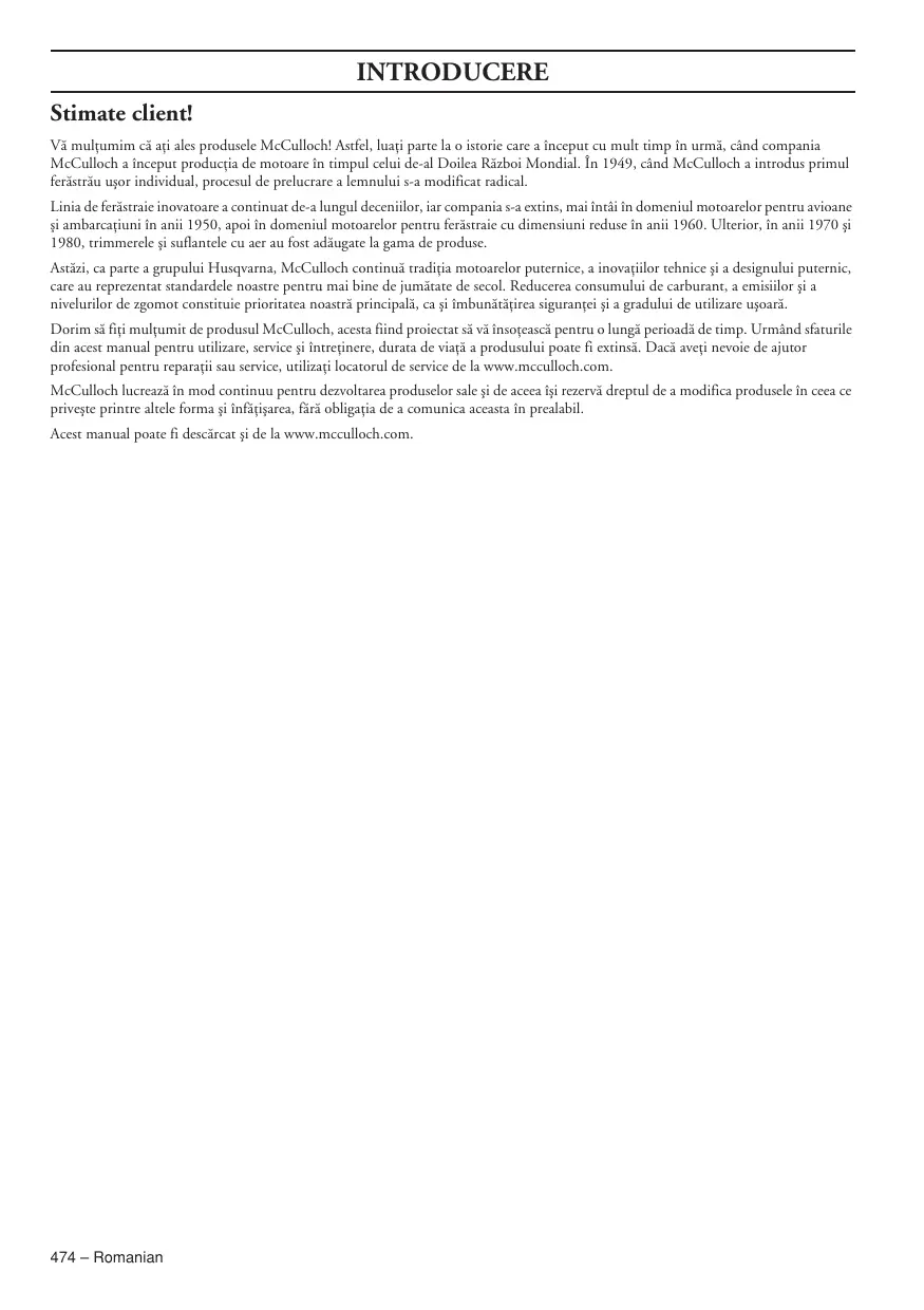 Romanian – 473 INTRODUCERE Stimate client! Vã mulöumim cã aöi ales produsele McCulloch! Astfel, luaöi parte la o istorie care a început cu mult timp în urmã, când compania McCulloch a început producöia de motoare în timpul celui de-al Doilea Rãzboi Mondial. În 1949, când McCulloch a introdus primul ferãstrãu uäor individual, procesul de prelucrare a lemnului s-a modificat radical. Linia de ferãstraie inovatoare a continuat de-a lungul deceniilor, iar compania s-a extins, mai întâi în domeniul motoarelor pentru avioane äi ambarcaöiuni în anii 1950, apoi în domeniul motoarelor pentru ferãstraie cu dimensiuni reduse în anii 1960. Ulterior, în anii 1970 äi 1980, trimmerele äi suflantele cu aer au fost adãugate la gama de produse. Astãzi, ca parte a grupului Husqvarna, McCulloch continuã tradiöia motoarelor puternice, a inovaöiilor tehnice äi a designului puternic, care au reprezentat standardele noastre pentru mai bine de jumãtate de secol. Reducerea consumului de carburant, a emisiilor äi a nivelurilor de zgomot constituie prioritatea noastrã principalã, ca äi îmbunãtãöirea siguranöei äi a gradului de utilizare uäoarã. Dorim sã fiöi mulöumit de produsul McCulloch, acesta fiind proiectat sã vã însoöeascã pentru o lungã perioadã de timp. Urmând sfaturile din acest manual pentru utilizare, service äi întreöinere, durata de viaöã a produsului poate fi extinsã. Dacã aveöi nevoie de ajutor profesional pentru reparaöii sau service, utilizaöi locatorul de service de la www.mcculloch.com. McCulloch lucreazã în mod continuu pentru dezvoltarea produselor sale äi de aceea îäi rezervã dreptul de a modifica produsele în ceea ce priveäte printre altele forma äi înfãöiäarea, fãrã obligaöia de a comunica aceasta în prealabil. Acest manual poate fi descãrcat äi de la www.mcculloch.com. 474 – Romanian