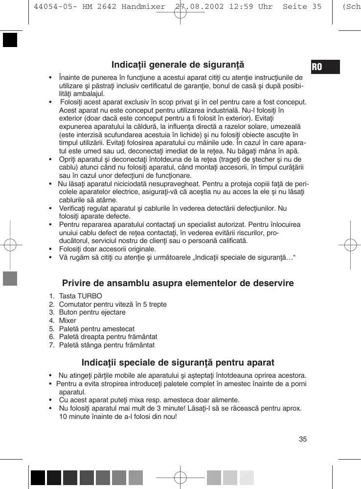 Indicaflii speciale de siguranflæ pentru aparat • Nu atingefli pærflile mobile ale aparatului øi aøteptafli întotdeauna oprirea acestora. • Pentru a evita stropirea introducefli paletele complet în amestec înainte de a porni aparatul. • Cu acest aparat putefli mixa resp. amesteca doar alimente. • Nu folosifli aparatul mai mult de 3 minute! Læsafli-l sæ se ræceascæ pentru aprox. 10 minute înainte de a-l folosi din nou! 35
