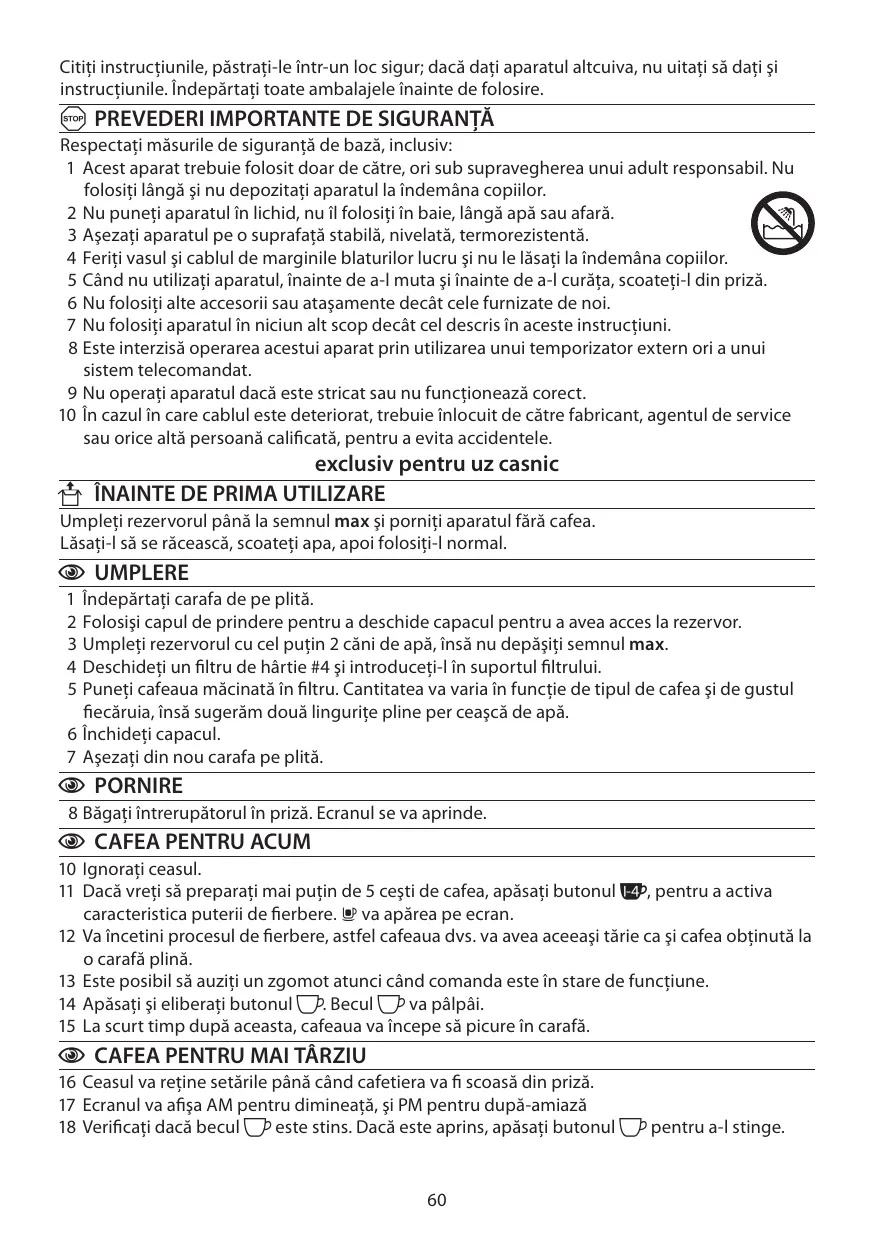 16 Ceasul va retine setärile panà cand cafetiera va fi scoasà din prizä.