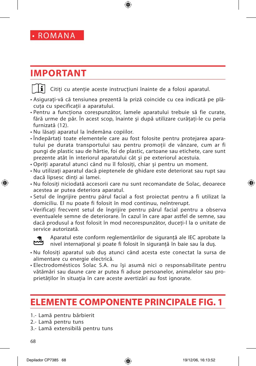 Descărcați instrucțiunile pentru Aparat de ras electric în format PDF gratuit! Găsiți manualul dvs. CP7385 - SOLAC și luați din nou în mână dispozitivul dvs. electronic. Pe această pagină sunt publicate toate documentele necesare pentru utilizarea dispozitivului dvs. CP7385 mărcii SOLAC.
