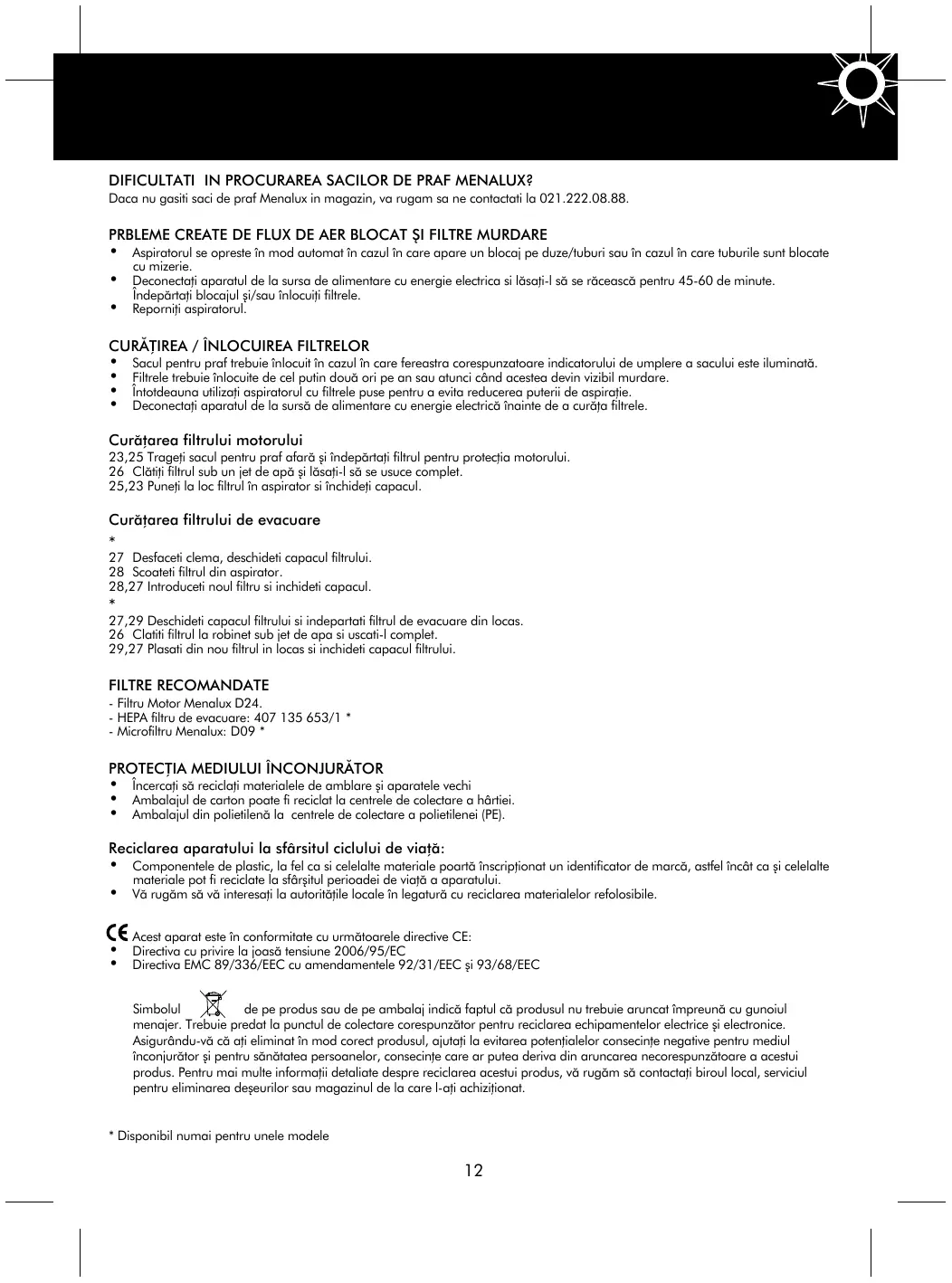 Saculpe ntru praftre b uie înl ocuitîn cazulîn care fe re as tra core s punzatoare indicatorul ui de um pl e re a s acul ui e s te il um inată. Fil tre l e tre b uie înl ocuite de ce lputin două ori pe an s au atunci când ace s te a de vin vizib ilm urdare . Întotde auna util izaţi as piratorulcu fil tre l e pus e pe ntru a e vita re duce re a pute rii de as piraţie . D e cone ctaţi aparatulde l a s urs ă de al im e ntare cu e ne rgie e l e ctrică înainte de a curăţa fil tre l