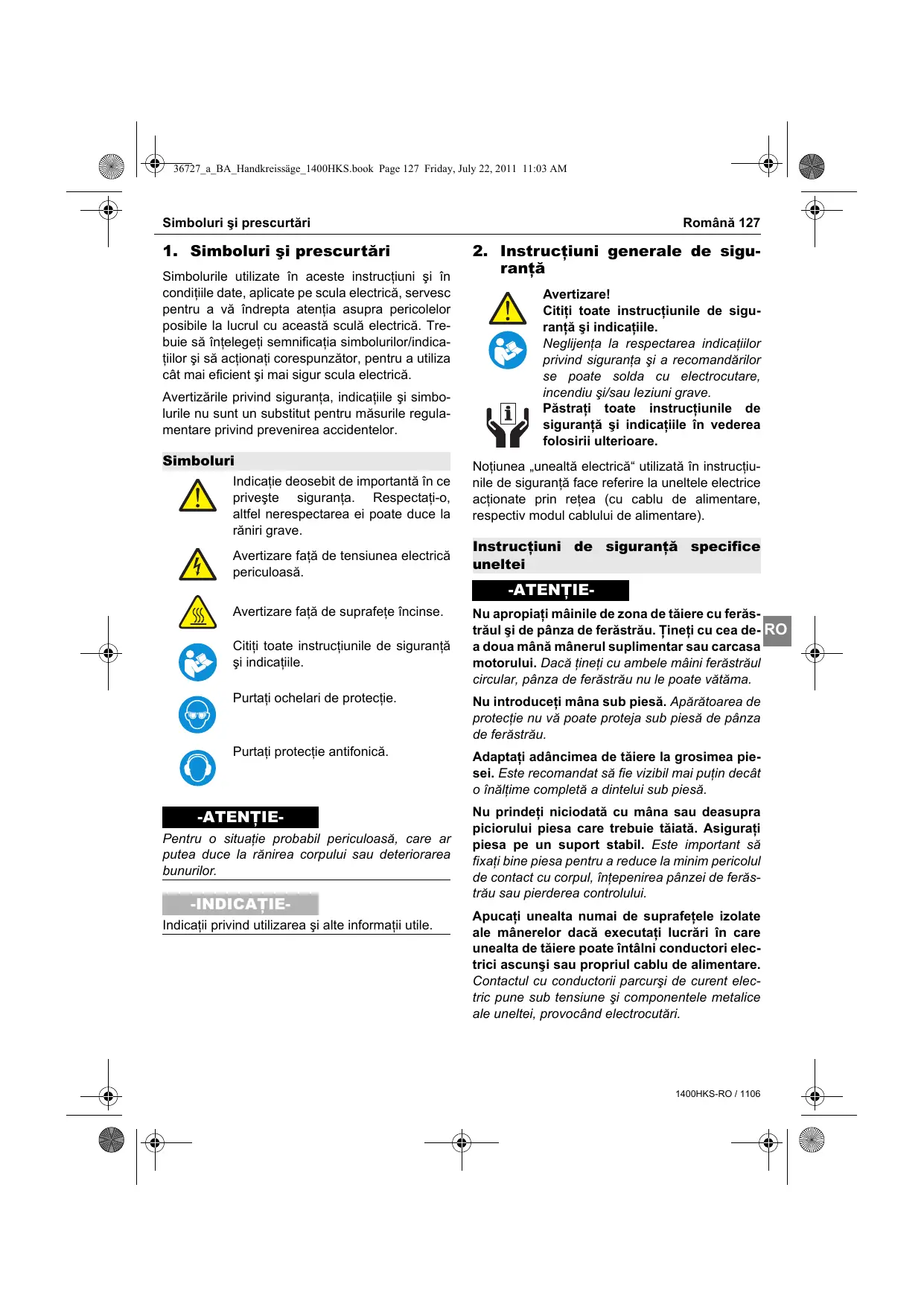 Alegerea corectä a pânzei de ferästräu se orien- teazä dupä tipul lemnului, calitatea lemnului si dupä necesitatea executäril täieturilor longitudi- nale sau oblice. La täieturile longitudinale în lemn de molid se formeazä aschi lungi, de formä spira- là. Praful de fag si stejar este foarte nociv pentru sänätate, lucrati din acest motiv numai cu sistemul de aspirare a prafului rea cu ferästräul în lemn Täierea materialului plastic La täierea materialelor plastice, în special a poli- clorurii de vinil, se formeazä agchii lungi, de formä spiralë, care pot f incärcate electrostatic. Astfel se poate infunda evacuarea pentru agchii (15) si apärätoarea oscilantä de protectie (11) se intepe- neste. Lucrati cel mai bine cu sistemul de aspirare a prafului. Aduceti ferästräul in stare pornitä în contact cu piese si täiati cu precautie. Continuati sä lucrali continuu si fr intreruperi pentru a evita lipirea rapidä a dintilor de ferästräu. ï de securitate gi indicatii care respectate obligatoriu » Este interzisä utilizarea pânzelor de ferästräu fisurate sau deformate. Lucrai numai cu pân- ze de ferästräu bune si ascutite! » Nu utilizati niciodatä în acest ferästräu pânze de ferästräu din otel rapid fnalt aliat/HSS » Este interzisä utilizarea pânzelor de ferästräu care nu corespund caracteristicilor indicate în aceste instructiuni de utilizare. 1400HKS-RO / 1106