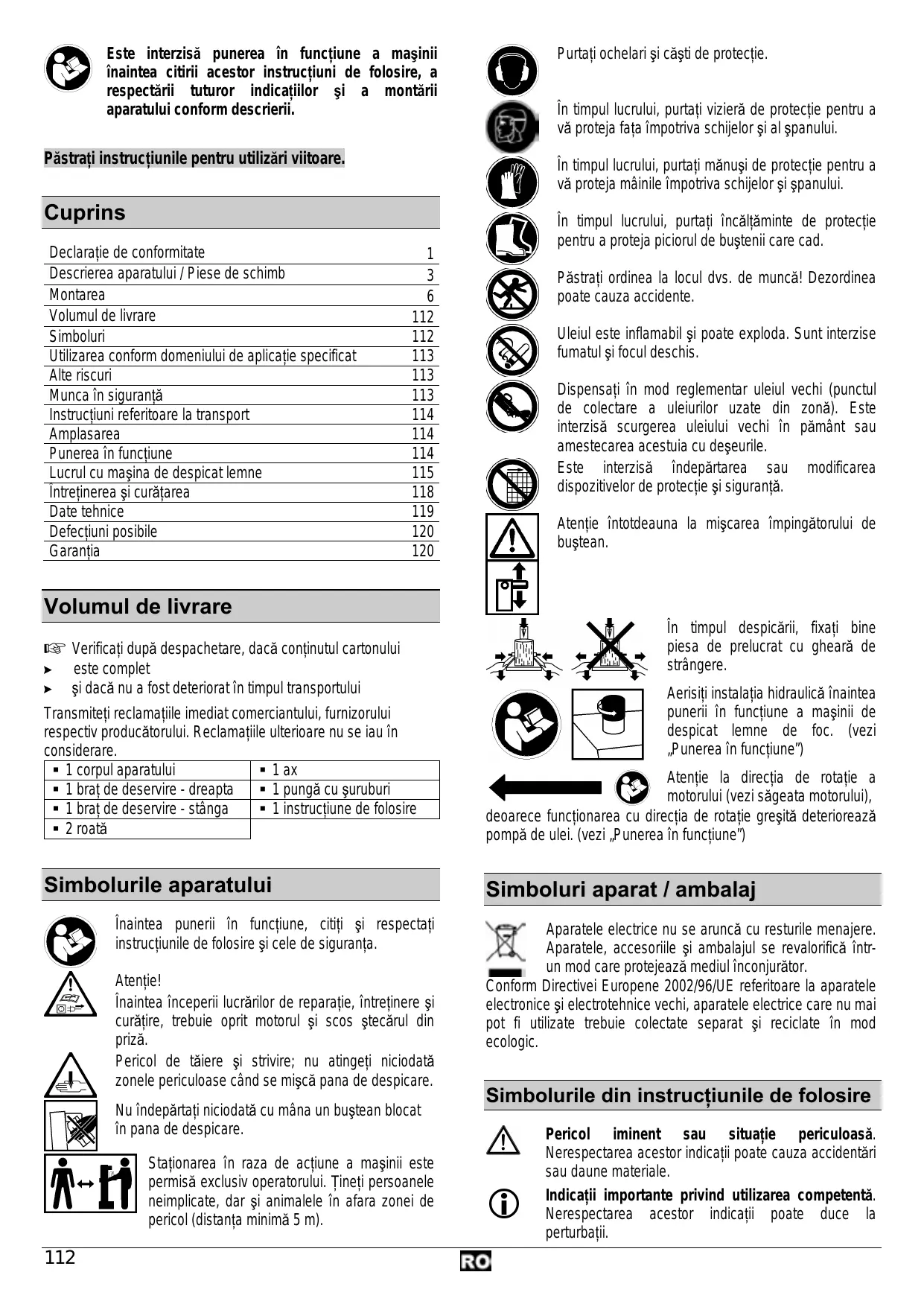 Păstraţi ordinea la locul dvs. de muncă! Dezordinea poate cauza accidente. Uleiul este inflamabil şi poate exploda. Sunt interzise fumatul şi focul deschis. Dispensaţi în mod reglementar uleiul vechi (punctul de colectare a uleiurilor uzate din zonă). Este interzisă scurgerea uleiului vechi în pământ sau amestecarea acestuia cu deşeurile. Este interzisă îndepărtarea sau modificarea dispozitivelor de protecţie şi siguranţă. Atenţie întotdeauna la mişcarea împingătorului de buştean. Volumul de livrare În timpul despicării, fixaţi bine piesa de prelucrat cu gheară de strângere. Verificaţi după despachetare, dacă conţinutul cartonului