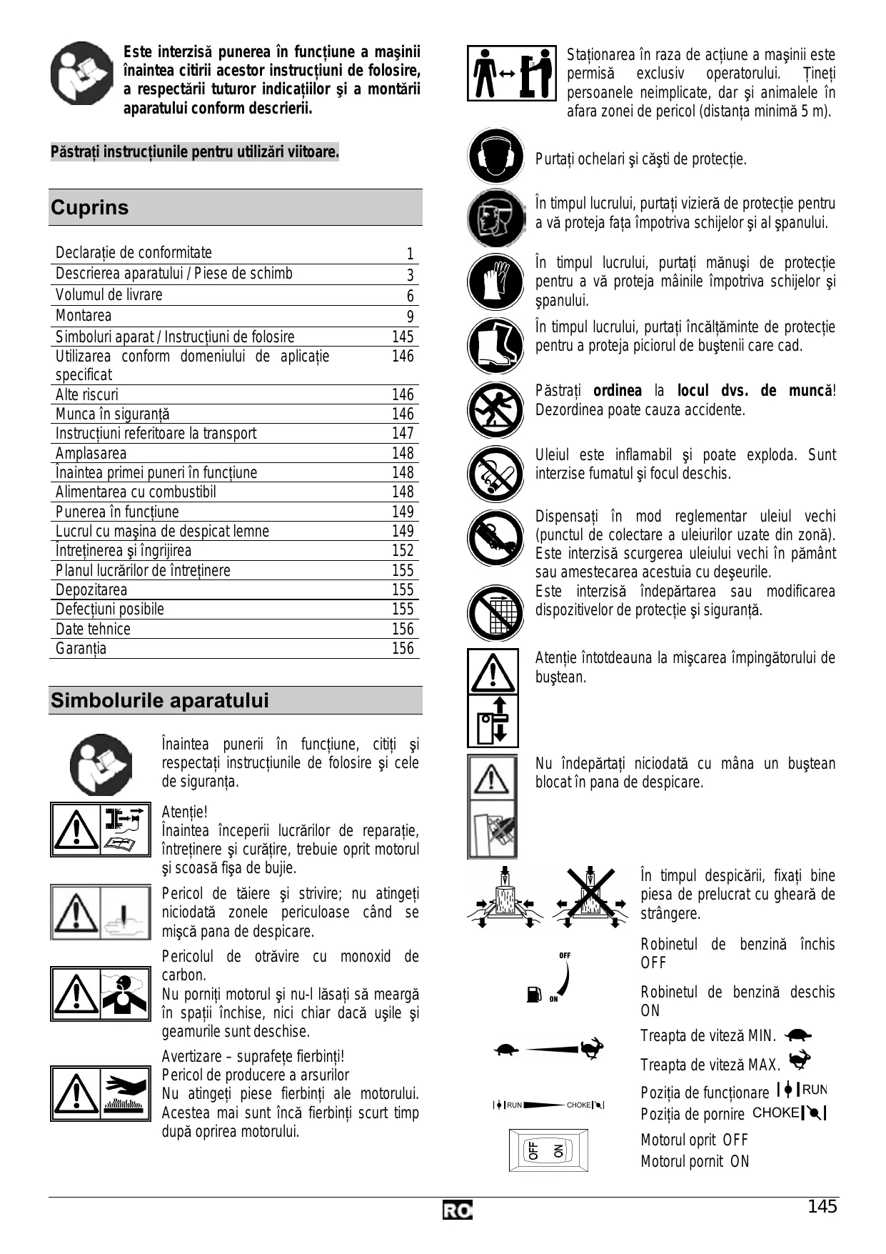 Simbolurile din instructiunile de folosire ÂÀ Pericol iminent sau situatie periculoasä. Nerespectarea acestor indicatii poate cauza accidentäri sau daune materiale, © Indicatii importante privind utilizarea competentä. Nerespectarea acestor indicatii poate duce la perturbatii. & Instructiuni de folosire. Aceste indicatii vä ajutä sà folositi in mod optim toate functille. Va Montarea, folosirea si intretinerea. Aici vi se explicä exact, ce aveti de fäcut. 1,12, numärul imagini corespunzätoare textului. “Prin neatentie, prin nerespectarea normelor de sigurantä si prin utilizarea necorespunzätoare, cutitul de despicat mobil poate provoca leziuni la mânà si degete. “_ Electrocutare la atingerea fisei de bujie când motorul este in functiune. “_ Pericol de ardere la atingerea pieselor fierbinti. “ Pericol de intoxicare cu monoxid de carbon la utilizarea aparatului in spatii inchise sau slab aerisite. “ Deteriorarea auzului datoritä unor lucräri indelungate färä protejarea auzului. Cu toate mäsurile de precautie luate mai pot rämâne niste riscuri, greu definibile. Munca în sigurantä Utilizarea conform domeniului de ap- licatie specificat " Utilizarea masinii de despicat lemne de foc este permisä exclusiv pentru despicarea lemnelor. =" Doar lemnul täiat drept se preteazä pentru masina de despicat lemne de foc. “ Bucätile de metal (cuie, etc.) trebuie neapärat indepärtate din materialul ce urmeazä sä fie despicat. =“ Prin folosirea conform domeniului de aplicatie specificat se intelege si respectarea conditillor de folosire, intretinere si reparatie, impuse de producätor, si respectarea mäsurilor de sigurantä preväzute în instructiuni. =" Orice alt mod de utilzare este considerat a nu fi în conformitate cu domeniul de aplicatie specificat. Producätorul nu räspunde de pagubele rezultate astfel - riscul si-l asumä în exclusivitate utilizatorul. =" Modificäri arbitrare ale masinii de despicat lemne de foc exclud räspunderea producätorului pentru pagube de orice fel rezultate din acestea. =" Montarea, utilizarea si intretinerea aparatului este permisäà doar persoanelor care cunosc aparatul si sunt informate in legäturä cu pericolele. Lucrärile de reparati pot fi efectuate numaïi de noi, respectiv de firme de prestare a servicillor numite de noi. Alte riscuri VAN În ciuda utilizärii corecte si a respectäri tuturor mäsurilor de protectie in vigoare, mai apar alte riscuri datoritä constructiei conform scopului de folosire. Aceste riscuri pot fi diminuate dacä se respectà ,Mäsurile de sigurantä”, ,Utilizarea conformä domeniului de aplicatie specificat destinatiei” si instructiunile de folosire în totalitate. Atentia si precautia diminueazä riscul accidentärii persoanelor si riscul pagubelor materiale. =“ Mäsurile de sigurantä ignorate sau trecute cu vederea pot duce la ränirea utilizatorului sau la däunarea proprietätil. VAN Prin urmare, înaintea punerii in functiune a utilajului, cititi si respectati indicatile urmätoare si mäsurile de prevenire a accidentelor ale asociatiei dumneavoasträ profesionale si indicatile de sigurantä, valabile în tara dumneavoasträ, pentru a vä feri pe dumneavoasträ si pe altii de accidente. © Transmiteti mäsurile de sigurantä tuturor persoanelor, care lucreazä cu aceastä masinà. © Pästrati aceste instructiuni de sigurantä. -_ Lucrati cu precautie. Fiti atent, la ce faceti. Lucrati rational. Nu folositi aparatul, când sunteti obosit sau sub influenta drogurilor, a alcoolului sau a medicamentelor. Un moment de neatentie în timpul folosiri aparatului poate conduce la accidente serioase. “ Familarizati-và cu acest utilaj inaintea puneri lui în functiune, cu ajutorul instructiunilor de folosire. “ Nu utilizati aparatul pentru alte domenii de aplicatie, pentru care nu à fost conceput (Vezi utilizarea conform domeniului de aplicatie specificat si ,Modul de lucru cu masina de despicat lemne pentru foc"). “_ Asigurati-vä stabilitatea $i mentineti-vä tot timpul echilibrul. “ Asezati-vä in pozitia de lucru, aflatä în spatele impingätorului în zona mänerului de comandä. Nu stati niciodatä în sfera de actiune a penei de despicat. =“ Nu stat niciodatà in picioare pe maginà. "in timpul lucrului purtati — ochelari sau mascä de protectie — mänusi de lucru — _eventual protectie a auzului — incältäminte de sigurantä cu protectie din otel = Purtati imbräcäminte de lucru potrivitä: — nu purtati haine largi sau bijuteri (pot fi prinse de pärtile mobile ale maginii) =" În perimetru de lucru al magini, persoana care o deserveste poartä räspunderea fatà de alte persoane. “_ Copiilor si tinerilor sub 18 ani le este interzisä folosirea masinil. =“ Pästrati copii la distantä de utila). “Nu utilzati niciodatä aparatul acolo, unde se aflä persoane neparticipante În apropiere.