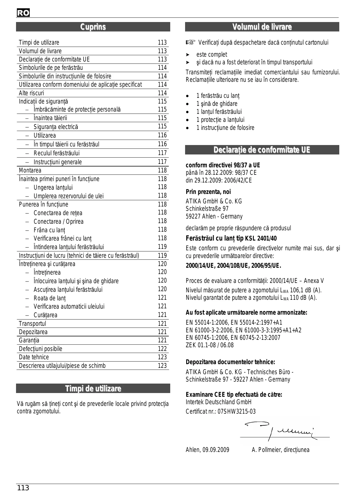 Ferăstrăul cu lanţ tip KSL 2401/40 Este conform cu prevederile directivelor numite mai sus, dar şi cu prevederile următoarelor directive: 2000/14/UE, 2004/108/UE, 2006/95/UE. Proces de evaluare a conformităţii: 2000/14/UE – Anexa V Nivelul măsurat de putere a zgomotului LWA 106,1 dB (A). Nivelul garantat de putere a zgomotului LWA 110 dB (A). Au fost aplicate următoarele norme armonizate: EN 55014-1:2006, EN 55014-2:1997+A1 EN 61000-3-2:2006, EN 61000-3-3:1995+A1+A2 EN 60745-1:2006, EN 60745-2-13:2007 ZEK 01.1-08 / 06.08 Depozitarea documentelor tehnice: ATIKA GmbH & Co. KG - Technisches Büro Schinkelstraße 97 - 59227 Ahlen - Germany Examinare CEE tip efectuată de către: Intertek Deutschland GmbH Certificat nr.: 07SHW3215-03