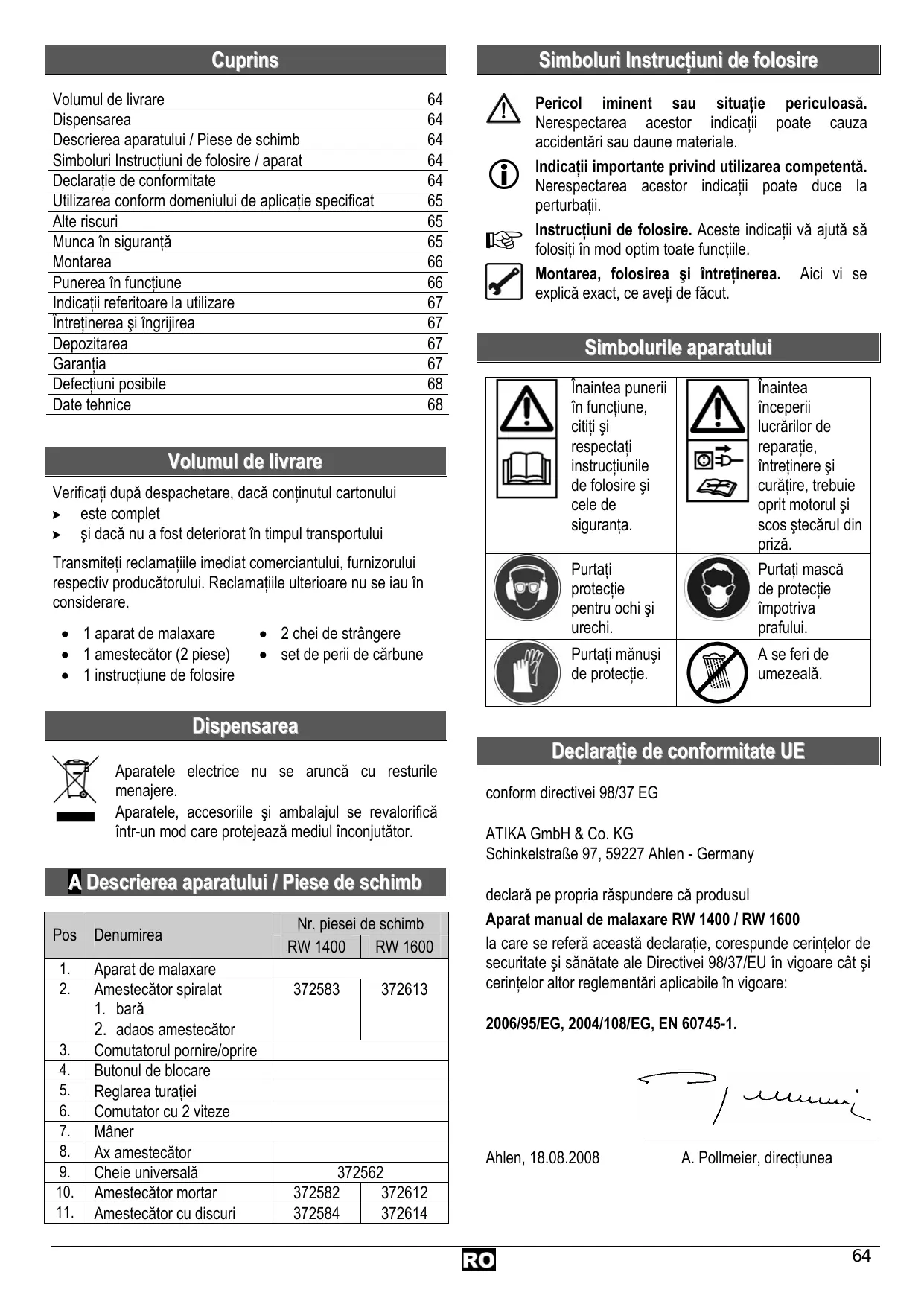 Declaraţie de conformitate UE conform directivei 98/37 EG ATIKA GmbH & Co. KG Schinkelstraße 97, 59227 Ahlen - Germany declară pe propria răspundere că produsul Aparat manual de malaxare RW 1400 / RW 1600 la care se referă această declaraţie, corespunde cerinţelor de securitate şi sănătate ale Directivei 98/37/EU în vigoare cât şi cerinţelor altor reglementări aplicabile în vigoare: 2006/95/EG, 2004/108/EG, EN 60745-1.
