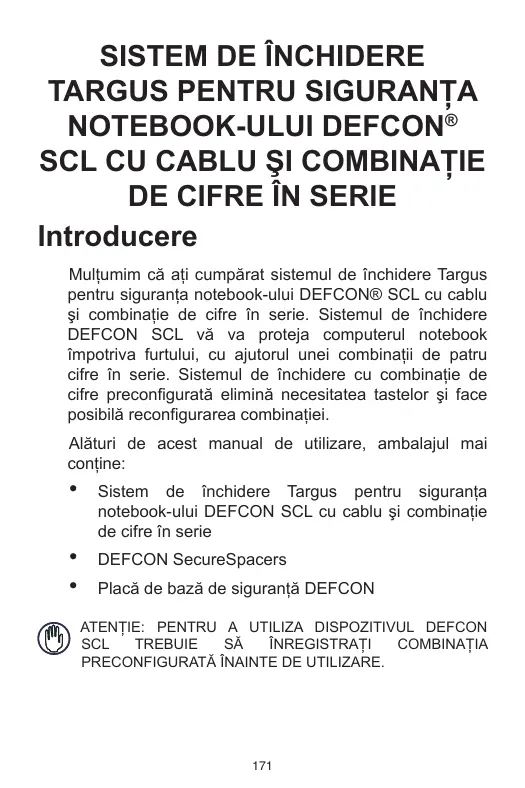 SISTEM DE ÎNCHIDERE TARGUS PENTRU SIGURANŢA NOTEBOOK-ULUI DEFCON® SCL CU CABLU ŞI COMBINAŢIE DE CIFRE ÎN SERIE Introducere Mulţumim că aţi cumpărat sistemul de închidere Targus pentru siguranţa notebook-ului DEFCON® SCL cu cablu şi combinaţie de cifre în serie. Sistemul de închidere DEFCON SCL vă va proteja computerul notebook împotriva furtului, cu ajutorul unei combinaţii de patru cifre în serie. Sistemul de închidere cu combinaţie de cifre preconfigurată elimină necesitatea tastelor şi face posibilă reconfigurarea combinaţiei. Alături de acest manual de utilizare, ambalajul mai conţine: