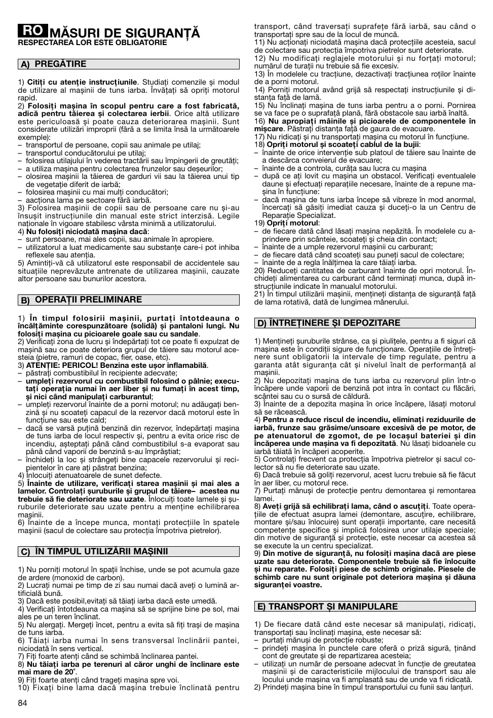 B) OPERAŢII PRELIMINARE 1) În timpul folosirii mașinii, purtaţi întotdeauna o încălţăminte corespunzătoare (solidă) și pantaloni lungi. Nu folosiţi mașina cu picioarele goale sau cu sandale. 2) Verificaţi zona de lucru și îndepărtaţi tot ce poate fi expulzat de mașină sau ce poate deteriora grupul de tăiere sau motorul acesteia (pietre, ramuri de copac, fier, oase, etc). 3) ATENŢIE: PERICOL! Benzina este ușor inflamabilă. – păstraţi combustibilul în recipiente adecvate; – umpleţi rezervorul cu combustibil folosind o pâlnie; executaţi operaţia numai în aer liber și nu fumaţi în acest timp, și nici când manipulaţi carburantul; – umpleţi rezervorul înainte de a porni motorul; nu adăugaţi benzină și nu scoateţi capacul de la rezervor dacă motorul este în funcţiune sau este cald; – dacă se varsă puţină benzină din rezervor, îndepărtaţi mașina de tuns iarba de locul respectiv și, pentru a evita orice risc de incendiu, așteptaţi până când combustibilul s-a evaporat sau până când vaporii de benzină s-au împrăștiat; – închideţi la loc și strângeţi bine capacele rezervorului și recipientelor în care aţi păstrat benzina; 4) Înlocuiţi atenuatoarele de sunet defecte. 5) Înainte de utilizare, verificaţi starea mașinii și mai ales a lamelor. Controlaţi șuruburile și grupul de tăiere– acestea nu trebuie să fie deteriorate sau uzate. Înlocuiţi toate lamele și șuruburile deteriorate sau uzate pentru a menţine echilibrarea mașinii. 6) Înainte de a începe munca, montaţi protecţiile în spatele mașinii (sacul de colectare sau protecţia împotriva pietrelor).