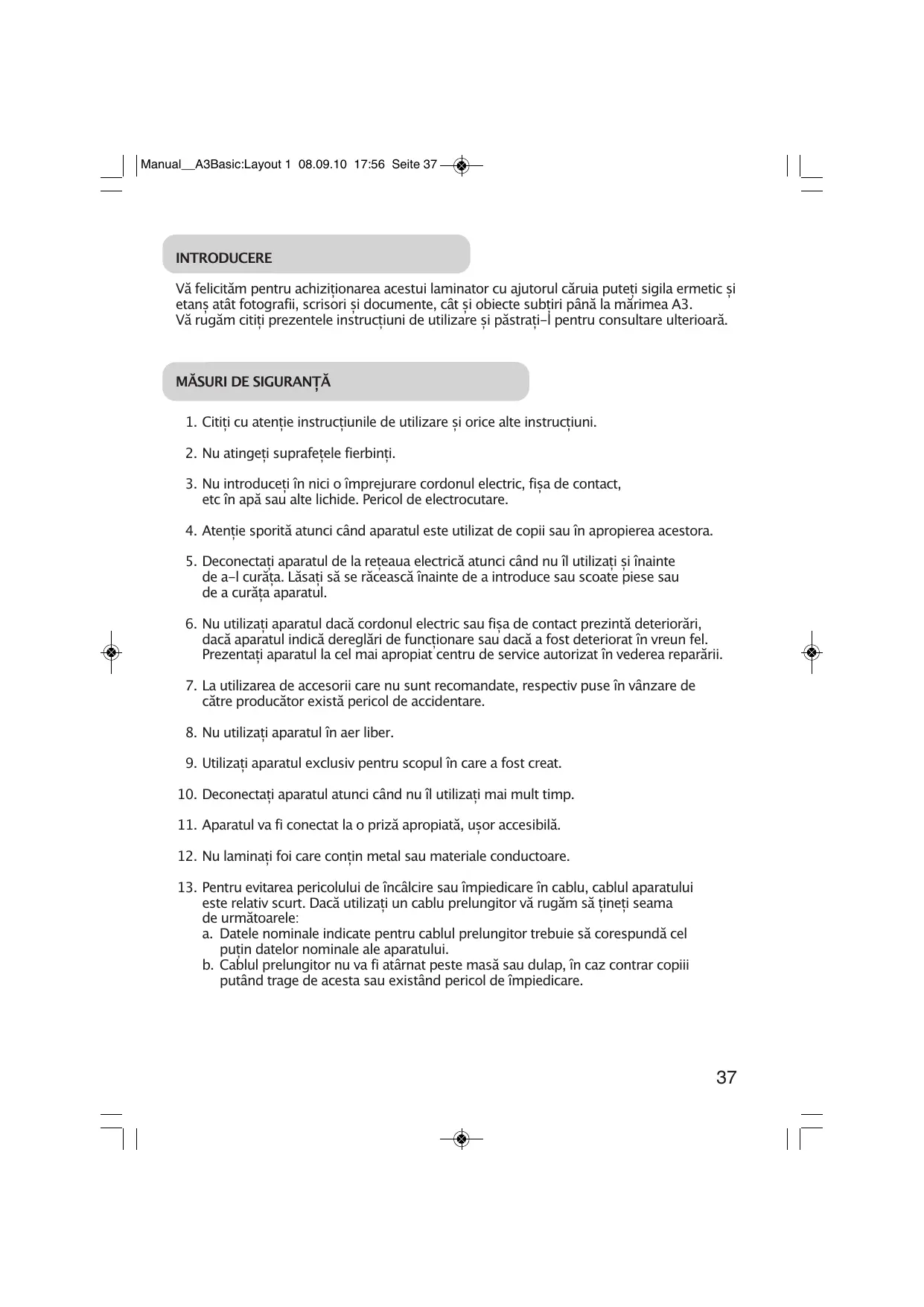 Manual__A3Basic:Layout 1 08.09.10 17:56 Seite 37 INTRODUCERE Vă felicităm pentru achiziționarea acestui laminator cu ajutorul căruia puteți sigila ermetic și etanș atât fotografii, scrisori și documente, cât și obiecte subțiri până la mărimea A3. Vă rugăm citiți prezentele instrucțiuni de utilizare și păstrați-l pentru consultare ulterioară.
