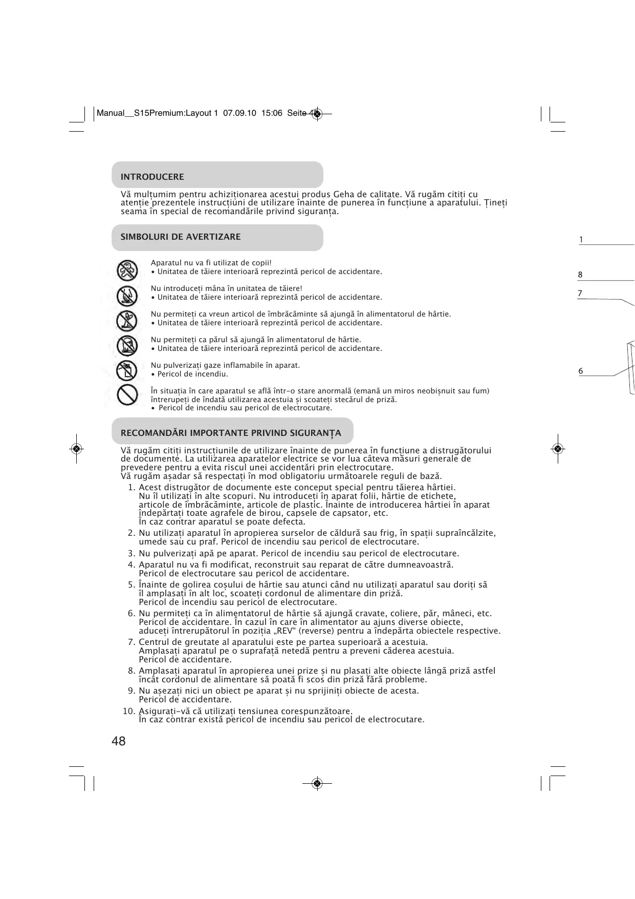 Vă rugăm cititi instructiunile de utilizare în inaunte de punerea in functiune a distrugătorului de documento. La Utilizarea aparatelor eletrice se vorlua căteva măsuri generale de prevedere pentru a evita riscul unei accidentari prin electrocutare.