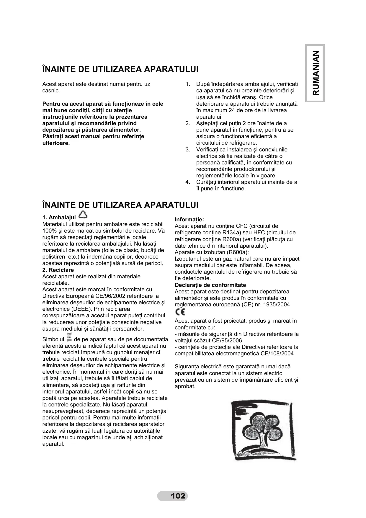 ATENTIE: La finalul duratei de'utilizar a aparatului, acesta trebuie reciclat in conformitate cu directiva DEEE. Acest aparat contine agent de refrigerare R600a 山 gaz inflamabil in spuma izolatoare.
