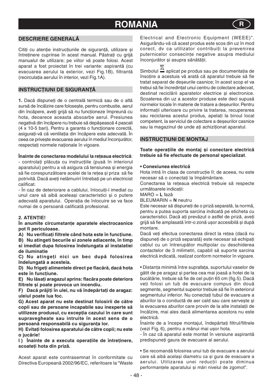 ROMANIA DESCRIERE GENERALĂ Citiţi cu atenţie instrucţiunile de siguranţă, utilizare și întreţinere cuprinse în acest manual. Păstraţi cu grijă manualul de utilizare; pe viitor vă poate folosi. Acest aparat a fost proiectat în trei variante: aspirantă (cu evacuarea aerului la exterior, vezi Fig.1B), filtrantă (recirculaţia aerului în interior, vezi Fig.1A).