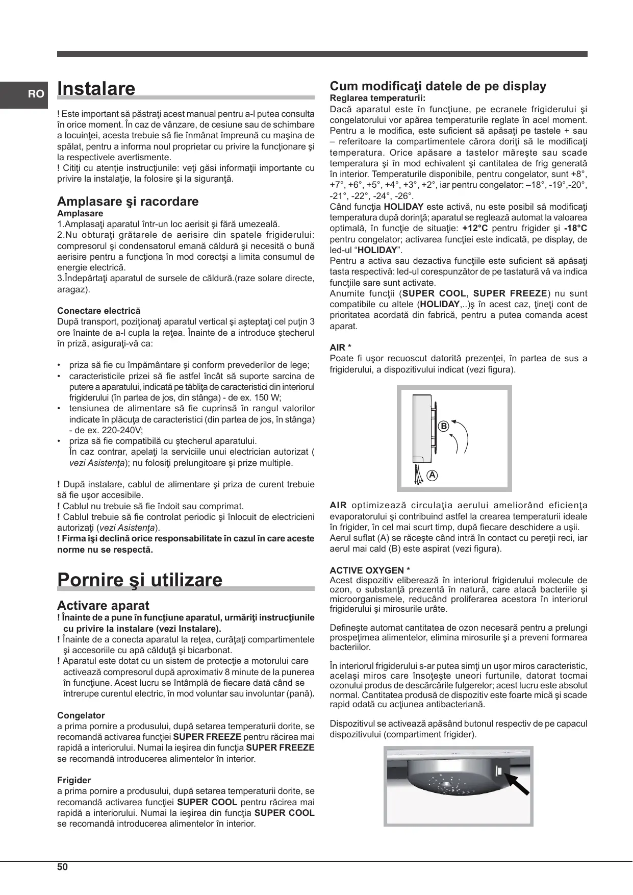 Reglarea temperaturii: Dacă aparatul este în funcţiune, pe ecranele frigiderului şi congelatorului vor apărea temperaturile reglate în acel moment. Pentru a le modifica, este suficient să apăsaţi pe tastele + sau – referitoare la compartimentele cărora doriţi să le modificaţi temperatura. Orice apăsare a tastelor măreşte sau scade temperatura şi în mod echivalent şi cantitatea de frig generată în interior. Temperaturile disponibile, pentru congelator, sunt +8°, +7°, +6°, +5°, +4°, +3°, +2°, iar pentru congelator: –18°, -19°,-20°, -21°, -22°, -24°, -26°. Când funcţia HOLIDAY este activă, nu este posibil să modificaţi temperatura după dorinţă; aparatul se reglează automat la valoarea optimală, în funcţie de situaţie: +12°C pentru frigider şi -18°C pentru congelator; activarea funcţiei este indicată, pe display, de led-ul “HOLIDAY”. Pentru a activa sau dezactiva funcţiile este suficient să apăsaţi tasta respectivă: led-ul corespunzător de pe tastatură vă va indica funcţiile sare sunt activate. Anumite funcţii (SUPER COOL, SUPER FREEZE) nu sunt compatibile cu altele (HOLIDAY,..)ş în acest caz, ţineţi cont de prioritatea acordată din fabrică, pentru a putea comanda acest aparat. AIR * Poate fi uşor recuoscut datorită prezenţei, în partea de sus a frigiderului, a dispozitivului indicat (vezi figura).