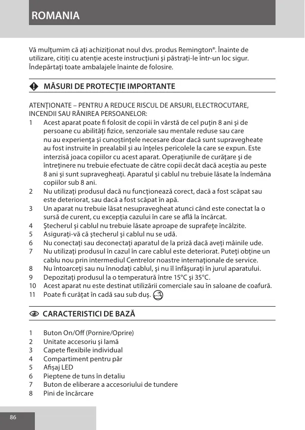 ROMANIA Vă mulţumim că aţi achiziţionat noul dvs. produs Remington®. Înainte de utilizare, citiţi cu atenţie aceste instrucţiuni şi păstraţi-le într-un loc sigur. Îndepărtaţi toate ambalajele înainte de folosire.