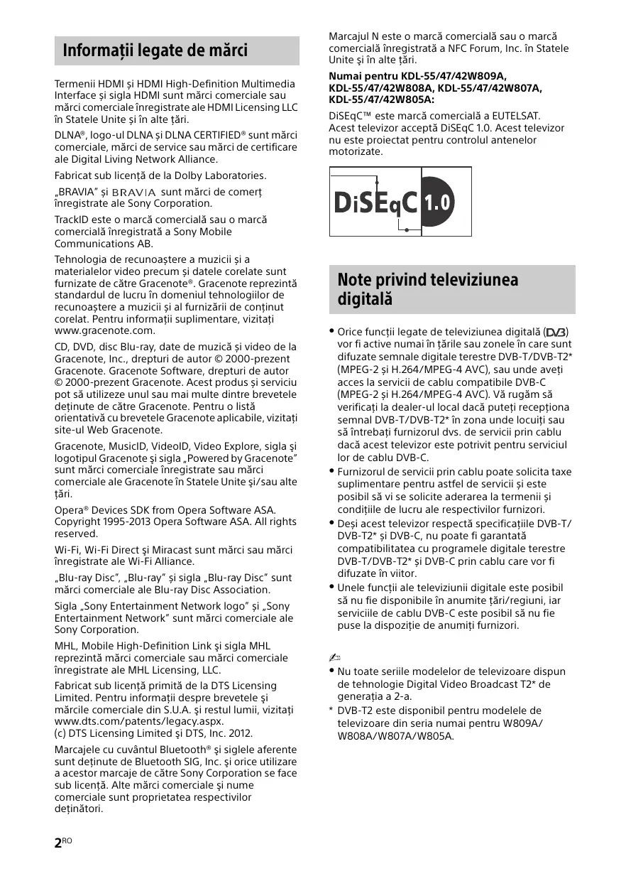 Készenléti üzemmódban*2 0,25 W (15 W szoftver-/EPG-frissítési üzemmódban) Kijelző felbontása 1 920 képpont (vízszintes) × 1 080 sor (függőleges) 5HU Informaţii legate de mărci Termenii HDMI și HDMI High-Definition Multimedia Interface și sigla HDMI sunt mărci comerciale sau mărci comerciale înregistrate ale HDMI Licensing LLC în Statele Unite și în alte ţări. DLNA®, logo-ul DLNA și DLNA CERTIFIED® sunt mărci comerciale, mărci de service sau mărci de certificare ale Digital Living Network Alliance. Marcajul N este o marcă comercială sau o marcă comercială înregistrată a NFC Forum, Inc. în Statele Unite şi în alte ţări. Numai pentru KDL-55/47/42W809A, KDL-55/47/42W808A, KDL-55/47/42W807A, KDL-55/47/42W805A: DiSEqC™ este marcă comercială a EUTELSAT. Acest televizor acceptă DiSEqC 1.0. Acest televizor nu este proiectat pentru controlul antenelor motorizate. Fabricat sub licenţă de la Dolby Laboratories. „BRAVIA” și sunt mărci de comerţ înregistrate ale Sony Corporation. TrackID este o marcă comercială sau o marcă comercială înregistrată a Sony Mobile Communications AB. Tehnologia de recunoaștere a muzicii și a materialelor video precum și datele corelate sunt furnizate de către Gracenote®. Gracenote reprezintă standardul de lucru în domeniul tehnologiilor de recunoaștere a muzicii și al furnizării de conţinut corelat. Pentru informaţii suplimentare, vizitaţi www.gracenote.com. CD, DVD, disc Blu-ray, date de muzică și video de la Gracenote, Inc., drepturi de autor © 2000-prezent Gracenote. Gracenote Software, drepturi de autor © 2000-prezent Gracenote. Acest produs și serviciu pot să utilizeze unul sau mai multe dintre brevetele deţinute de către Gracenote. Pentru o listă orientativă cu brevetele Gracenote aplicabile, vizitaţi site-ul Web Gracenote. Gracenote, MusicID, VideoID, Video Explore, sigla şi logotipul Gracenote şi sigla „Powered by Gracenote” sunt mărci comerciale înregistrate sau mărci comerciale ale Gracenote în Statele Unite şi/sau alte ţări. Opera® Devices SDK from Opera Software ASA. Copyright 1995-2013 Opera Software ASA. All rights reserved. Wi-Fi, Wi-Fi Direct şi Miracast sunt mărci sau mărci înregistrate ale Wi-Fi Alliance. „Blu-ray Disc”, „Blu-ray” și sigla „Blu-ray Disc” sunt mărci comerciale ale Blu-ray Disc Association. Sigla „Sony Entertainment Network logo” și „Sony Entertainment Network” sunt mărci comerciale ale Sony Corporation. MHL, Mobile High-Definition Link şi sigla MHL reprezintă mărci comerciale sau mărci comerciale înregistrate ale MHL Licensing, LLC. Fabricat sub licenţă primită de la DTS Licensing Limited. Pentru informaţii despre brevetele şi mărcile comerciale din S.U.A. şi restul lumii, vizitaţi www.dts.com/patents/legacy.aspx. (c) DTS Licensing Limited şi DTS, Inc. 2012. Marcajele cu cuvântul Bluetooth® şi siglele aferente sunt deţinute de Bluetooth SIG, Inc. şi orice utilizare a acestor marcaje de către Sony Corporation se face sub licenţă. Alte mărci comerciale şi nume comerciale sunt proprietatea respectivilor deţinători. 2RO Note privind televiziunea digitală Orice funcţii legate de televiziunea digitală ( vor fi active numai în ţările sau zonele în care sunt difuzate semnale digitale terestre DVB-T/DVB-T2* (MPEG-2 și H.264/MPEG-4 AVC), sau unde aveţi acces la servicii de cablu compatibile DVB-C (MPEG-2 și H.264/MPEG-4 AVC). Vă rugăm să verificaţi la dealer-ul local dacă puteţi recepţiona semnal DVB-T/DVB-T2* în zona unde locuiţi sau să întrebaţi furnizorul dvs. de servicii prin cablu dacă acest televizor este potrivit pentru serviciul lor de cablu DVB-C. Furnizorul de servicii prin cablu poate solicita taxe suplimentare pentru astfel de servicii și este posibil să vi se solicite aderarea la termenii și condiţiile de lucru ale respectivilor furnizori. Deși acest televizor respectă specificaţiile DVB-T/ DVB-T2* și DVB-C, nu poate fi garantată compatibilitatea cu programele digitale terestre DVB-T/DVB-T2* și DVB-C prin cablu care vor fi difuzate în viitor. Unele funcţii ale televiziunii digitale este posibil să nu fie disponibile în anumite ţări/regiuni, iar serviciile de cablu DVB-C este posibil să nu fie puse la dispoziţie de anumiţi furnizori. Nu toate seriile modelelor de televizoare dispun de tehnologie Digital Video Broadcast T2* de generaţia a 2-a.
