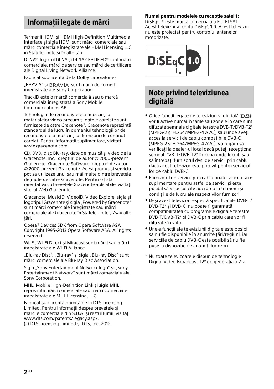 Az Üzembe helyezési útmutatóban, a Referencia útmutatóban és a Biztonsági előírásokban szereplő képek és ábrázolások csak hivatkozásul szolgálnak, és eltérhetnek a valós termék megjelenésétől. A modellnévben szereplő „x” a formára, a színváltozatra vagy a televízió-rendszerre vonatkozó számjegynek felel meg. Ne vegye ki a vakkártyát a tv CAM (feltételes hozzáférési modul) kártyanyílásából, csak amikor intelligens kártyát helyet be a CAM kártyanyílásba. A külön megvásárolható tartozékok elérhetősége az országtól/régiótól/tv-típus/árukészlettől függ. A forma és a műszaki adatok előzetes bejelentés nélkül megváltozhatnak. 6HU Informaţii legate de mărci Termenii HDMI și HDMI High-Definition Multimedia Interface și sigla HDMI sunt mărci comerciale sau mărci comerciale înregistrate ale HDMI Licensing LLC în Statele Unite și în alte ţări. Numai pentru modelele cu recepție satelit: DiSEqC™ este marcă comercială a EUTELSAT. Acest televizor acceptă DiSEqC 1.0. Acest televizor nu este proiectat pentru controlul antenelor motorizate. DLNA®, logo-ul DLNA și DLNA CERTIFIED® sunt mărci comerciale, mărci de service sau mărci de certificare ale Digital Living Network Alliance. Fabricat sub licenţă de la Dolby Laboratories. „BRAVIA” și sunt mărci de comerţ înregistrate ale Sony Corporation. TrackID este o marcă comercială sau o marcă comercială înregistrată a Sony Mobile Communications AB. Tehnologia de recunoaștere a muzicii și a materialelor video precum și datele corelate sunt furnizate de către Gracenote®. Gracenote reprezintă standardul de lucru în domeniul tehnologiilor de recunoaștere a muzicii și al furnizării de conţinut corelat. Pentru informaţii suplimentare, vizitaţi www.gracenote.com. CD, DVD, disc Blu-ray, date de muzică și video de la Gracenote, Inc., drepturi de autor © 2000-prezent Gracenote. Gracenote Software, drepturi de autor © 2000-prezent Gracenote. Acest produs și serviciu pot să utilizeze unul sau mai multe dintre brevetele deţinute de către Gracenote. Pentru o listă orientativă cu brevetele Gracenote aplicabile, vizitaţi site-ul Web Gracenote. Gracenote, MusicID, VideoID, Video Explore, sigla şi logotipul Gracenote şi sigla „Powered by Gracenote” sunt mărci comerciale înregistrate sau mărci comerciale ale Gracenote în Statele Unite şi/sau alte ţări. Opera® Devices SDK from Opera Software ASA. Copyright 1995-2013 Opera Software ASA. All rights reserved. Wi-Fi, Wi-Fi Direct şi Miracast sunt mărci sau mărci înregistrate ale Wi-Fi Alliance. „Blu-ray Disc”, „Blu-ray” și sigla „Blu-ray Disc” sunt mărci comerciale ale Blu-ray Disc Association. Sigla „Sony Entertainment Network logo” și „Sony Entertainment Network” sunt mărci comerciale ale Sony Corporation. MHL, Mobile High-Definition Link şi sigla MHL reprezintă mărci comerciale sau mărci comerciale înregistrate ale MHL Licensing, LLC. Fabricat sub licenţă primită de la DTS Licensing Limited. Pentru informaţii despre brevetele şi mărcile comerciale din S.U.A. şi restul lumii, vizitaţi www.dts.com/patents/legacy.aspx. (c) DTS Licensing Limited şi DTS, Inc. 2012. 2RO Note privind televiziunea digitală Orice funcţii legate de televiziunea digitală ( vor fi active numai în ţările sau zonele în care sunt difuzate semnale digitale terestre DVB-T/DVB-T2* (MPEG-2 și H.264/MPEG-4 AVC), sau unde aveţi acces la servicii de cablu compatibile DVB-C (MPEG-2 și H.264/MPEG-4 AVC). Vă rugăm să verificaţi la dealer-ul local dacă puteţi recepţiona semnal DVB-T/DVB-T2* în zona unde locuiţi sau să întrebaţi furnizorul dvs. de servicii prin cablu dacă acest televizor este potrivit pentru serviciul lor de cablu DVB-C. Furnizorul de servicii prin cablu poate solicita taxe suplimentare pentru astfel de servicii și este posibil să vi se solicite aderarea la termenii și condiţiile de lucru ale respectivilor furnizori. Deși acest televizor respectă specificaţiile DVB-T/ DVB-T2* și DVB-C, nu poate fi garantată compatibilitatea cu programele digitale terestre DVB-T/DVB-T2* și DVB-C prin cablu care vor fi difuzate în viitor. Unele funcţii ale televiziunii digitale este posibil să nu fie disponibile în anumite ţări/regiuni, iar serviciile de cablu DVB-C este posibil să nu fie puse la dispoziţie de anumiţi furnizori.