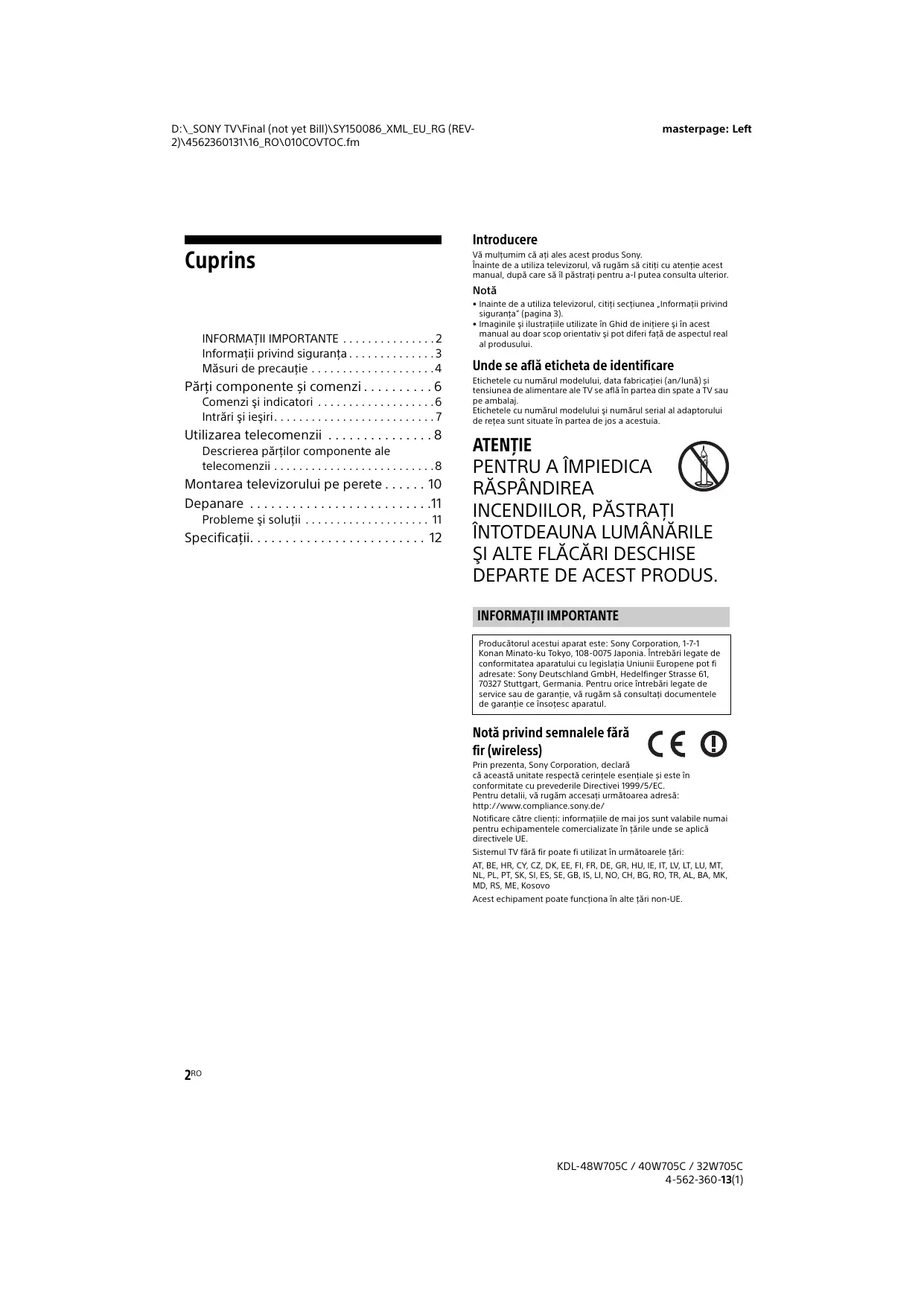 D:\_SONY TV\Final (not yet Bill)\SY150086_XML_EU_RG (REV2)\4562360131\16_RO\010COVTOC.fm masterpage: Left Introducere Cuprins Vă mulțumim că ați ales acest produs Sony. Înainte de a utiliza televizorul, vă rugăm să citiți cu atenție acest manual, după care să îl păstrați pentru a-l putea consulta ulterior. Notă