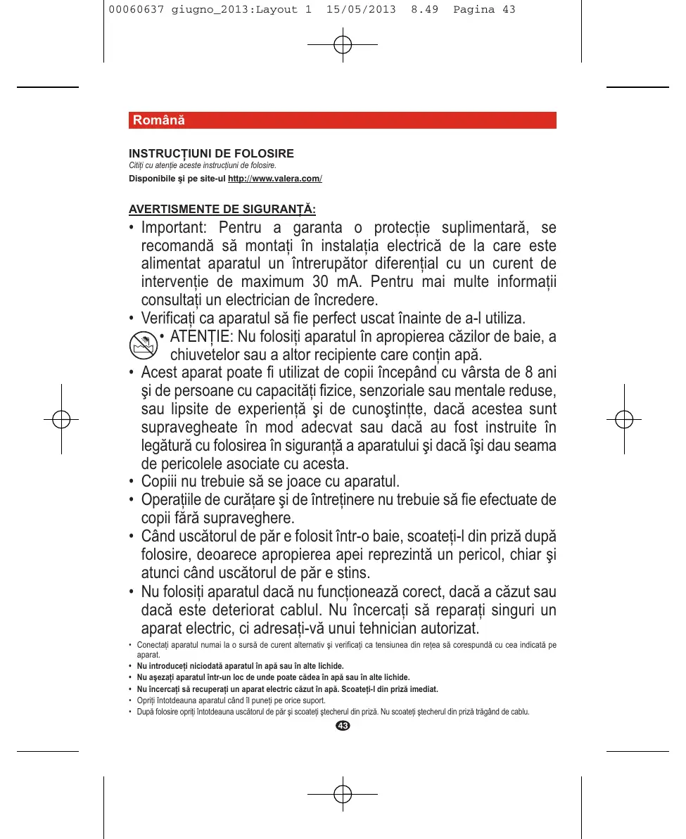 Română INSTRUCŢIUNI DE FOLOSIRE Citiţi cu atenţie aceste instrucţiuni de folosire. Disponibile şi pe site-ul http://www.valera.com/