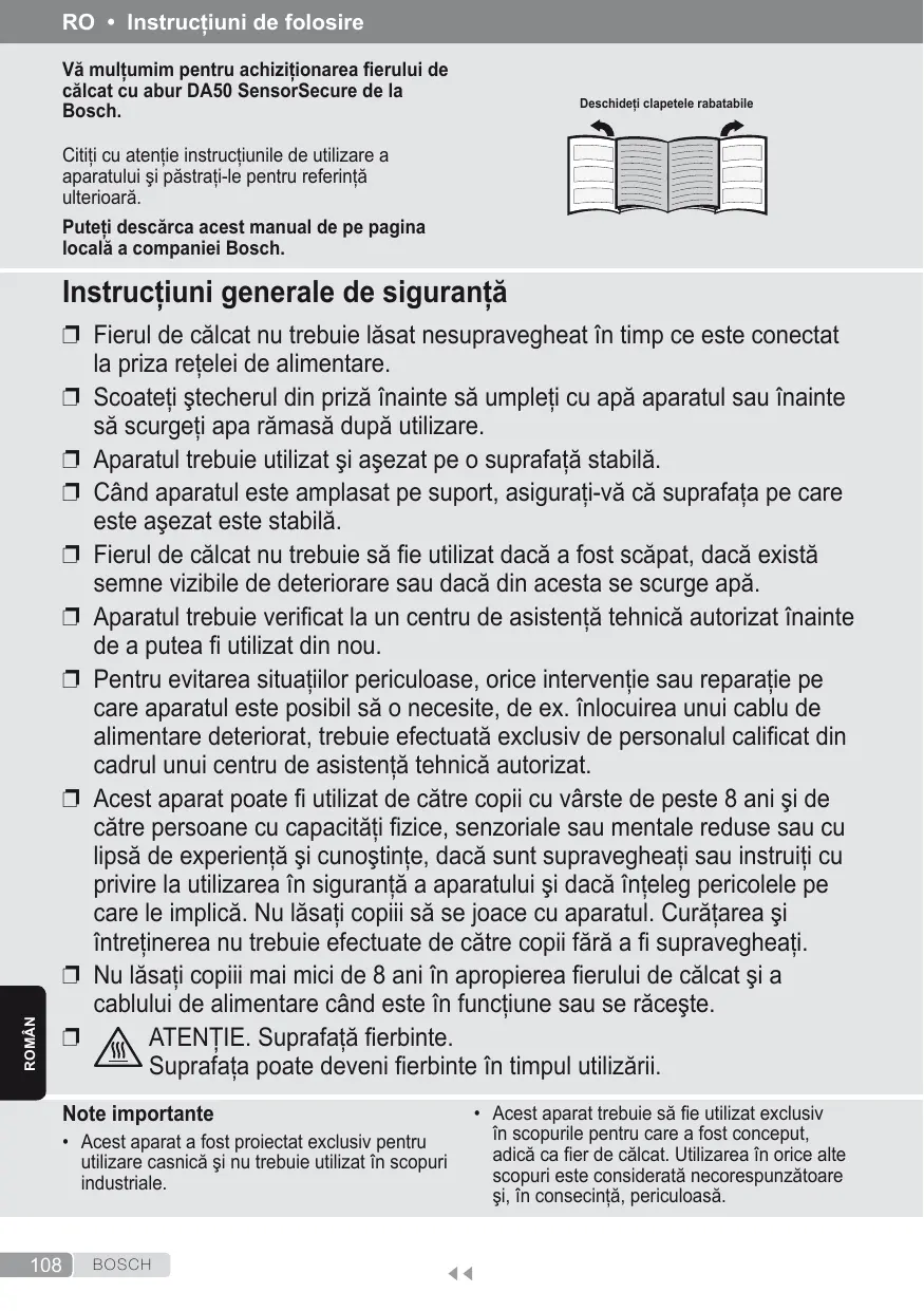 Vä multumim pentru achizitionarea fierului de cälcat cu abur DA50 SensorSecure de la Bosch. Cititi cu atentie instructiunile de utilizare a aparatului si pästrati-le pentru referintä ulterioarä. Puteti descärca acest manual de pe pagina localä a companiei Bosch. Instructiuni generale de sigurantä A Fierul de cälcat nu trebuie läsat nesupravegheat în timp ce este conectat la priza retelei de alimentare. {A Scoateti stecherul din prizä înainte sä umpleti cu apä aparatul sau înainte sà scurgeti apa rämasä dupä utilizare. © Aparatul trebuie utilizat si açezat pe o suprafatä stabilä. { Când aparatul este amplasat pe suport, asigurati-vä cà suprafata pe care este asezat este stabilà. A Fierul de cälcat nu trebuie sä fie utilizat dacä a fost scäpat, dacä existà semne vizibile de deteriorare sau dacä din acesta se scurge apä. © Aparatul trebuie verificat la un centru de asistentä tehnicä autorizat înainte de a putea fi utilizat din nou. © Pentru evitarea situatilor periculoase, orice interventie sau reparatie pe care aparatul este posibil sä o necesite, de ex. inlocuirea unui cablu de alimentare deteriorat, trebuie efectuatà exclusiv de personalul calificat din cadrul unui centru de asistentä tehnicä autorizat. A Acest aparat poate fi utilizat de cätre copii cu vârste de peste 8 ani si de cätre persoane cu capacitäti fizice, senzoriale sau mentale reduse sau cu lipsä de experientä si cunostinte, dacä sunt supravegheati sau instruiti cu privire la utilizarea în sigurantä a aparatului si dacä inteleg pericolele pe care le implicä. Nu läsati copiii sà se joace cu aparatul. Curätarea si întretinerea nu trebuie efectuate de câtre copii färä a fi supravegheati. {A Nu läsati copiii mai mici de 8 ani în apropierea fierului de cälcat si a cablului de alimentare când este în functiune sau se räceste. Q PIN ATENTIE. Suprafatä fierbinte. Suprafata poate deveni fierbinte în timpul utilizärii. Note importante + Acest aparat trebuie sä fie utilizat exclusiv + Acest aparat a fost proiectat exclusiv pentru mere per AS conceput, h utilizare casnicà si nu trebuie utilizat in scopuri adicä ca fier de cälcat. Utilizarea în orice alte industriale. scopuri este consideratä necorespunzätoare si, în consecintä, periculoasä. BOSCH