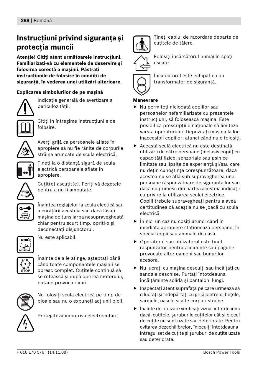 Încărcătorul este echipat cu un transformator de siguranţă. Explicarea simbolurilor de pe maşină Indicaţie generală de avertizare a periculozităţii. Citiţi în întregime instrucţiunile de folosire. Averţi grijă ca persoanele aflate în apropiere să nu fie rănite de corpurile străine aruncate de scula electrică. Ţineţi la o distanţă sigură de scula electrică persoanele aflate în apropiere. Cuţit(e) ascuţit(e). Feriţi-vă degetele pentru a nu fi amputate. Înaintea reglajelor la scula electică sau a curăţării acesteia sau dacă lăsaţi maşina de tuns iarba nesupravegheată chiar pentru scurt timp, opriţi-o şi deconectaţi disjunctorul. Nu este aplicabil. STOP Înainte de a le atinge, aşteptaţi până când toate componentele maşinii se opresc complet. Cuţitele continuă să se rotească şi după oprirea motorului, putând provoca răniri. Nu folosiţi scula electrică pe timp de ploaie sau nu o expuneţi acţiunii ploii. Protejaţi-vă împotriva electrocutării. F 016 L70 576 | (14.11.08) Manevrare f Nu permiteţi niciodată copiilor sau persoanelor nefamiliarizate cu prezentele instrucţiuni, să folosească maşina. Este posibil ca prescripţiile naţionale să limiteze vârsta operatorului. Depozitaţi maşina la loc inaccesibil copiilor, atunci când nu o folosiţi. f Această sculă electrică nu este destinată utilizării de către persoane (inclusiv copii) cu capacităţi fizice, senzoriale sau psihice limitate sau lipsite de experienţă şi/sau care nu deţin cunoştinţe corespunzătoare, dacă acestea nu se află sub supravegherea unei persoane răspunzătoare de siguranţa lor sau dacă nu primesc din partea acesteia indicaţii cu privire la utilizarea sculei electrice. Copiii trebuie supravegheaţi pentru a avea certitudinea că aceştia nu se joacă cu scula electrică. f În nici un caz nu cosiţi atunci când în imediata apropiere staţionează persoane, în special copii sau animale de casă. f Operatorul sau utilizatorul este ţinut răspunzător pentru accidente sau pagube provocate altor oameni sau bunurilor acesora. f Nu lucraţi cu maşina desculţi sau încălţaţi cu sandale deschise. Purtaţi întotdeauna încălţăminte solidă şi pantaloni lungi. f Inspectaţi atent suprafaţa pe care urmează să o lucraţi şi îndepărtaţi cu grijă pietrele, beţele, sârmele, oasele şi alte corpuri străine. f Înainte de utilizare verificaţi vizual întotdeauna dacă, cuţitele, şuruburile cuţitelor cât şi blocul de cuţite nu sunt uzate sau deteriorate. Pentru evitarea dezechilibrelor, înlocuiţi întotdeauna întregul set de cuţite şi şuruburi de cuţite uzate sau deteriorate. Bosch Power Tools Românã | 289 f Cosiţi numai la lumina zilei sau la lumină artificială bună. f Menţineţi distanţa faţă de zona de aruncare, atunci când lucraţi cu maşina. f Pe cât posibil, nu folosiţi maşina pentru tunderea ierbii ude. f Nu ridicaţi respectiv nu transportaţi niciodată maşina cu motorul pornit. f Păşiţi întotdeauna încet, nu alergaţi niciodată repede. Deonectaţi disjunctorul: f Nu folosiţi niciodată maşina de tuns iarba cu dispozitive de protecţie, capace de acoperire defecte sau fără echipamente de siguranţa şi protecţia muncii, ca de exemplu apărătoare şi/ sau coş colector de iarbă. f Cosirea ierbii pe taluzuri poate fi periculoasă. – Nu cosiţi în pantă foarte abruptă. – Fiţi întotdeauna atenţi, astfel încât să păşiţi în siguranţă pe suprafeţele înclinate sau pe iarba udă. – Pe suprafeţele înclinate cosiţi întotdeauna transversal şi niciodată în sus şi în jos. – La schimbarea direcţiei în pante fiţi extrem de precauţi. – întotdeauna când părăsiţi locul în care se află maşina, – înainte de a îndepărta blocajele, – când verificaţi, curăţaţi sau lucraţi la maşină, – după o coliziune cu un corp străin. Verificaţi imediat maşina cu privire la eventuale deteriorări iar dacă este necesar, daţi-o la reparat, – când maşina începe să vibreze în mod neobişnuit (verificaţi imediat). Întreţinere f Pentru a garanta starea bună de funcţionare a maşinii, asiguraţi-vă de poziţia fixă a piuliţelor, bolţurilor şi şuruburilor. f Fiţi extrem de precauţi atunci când mergeţi înapoi sau trageţi maşina. f Controlaţi regulat starea şi gradul de uzură al coşului colector de iarbă. f La cosire împingeţi întotdeauna înainte maşina de tuns iarba şi în nici un caz nu o trageţi spre corpul dumneavoastră. f Verificaţi maşina şi înlocuiţi, din considerente legate de siguranţă, componentele uzate sau deteriorate ale acesteia. f Cuţitele trebuie să fie oprite, atunci când maşina de tuns iarba urmează a fi răsturnată în vederea transportului, când se traversează suprafeţe necultivate şi în timpul transportului spre şi de la zona care trebuie cosită. f Nu răsturnaţi maşina în momentul pornirii sau demarării motorului, în afara cazului când maşina trebuie pornită în iaba crescută înalt. În această situaţie nu ridicaţi mai mult decât este absolut necesar partea îndepărtată de la operator. Aveţi grijă să ţineţi mâinile pe mâner, atunci când lăsaţi jos maşina. f Conectaţi maşina conform celor descrise în instrucţiunile de folosire şi aveţi grijă să vă ţineţi picioarele suficient de departe de componentele care se rotesc. f Nu ţineţi mâinile şi picioareţe în apropierea sau sub piesele care se rotesc. Bosch Power Tools f Folosiţi numai cuţite de tăiere prevăzute pentru această sculă electrică. f Asiguraţi-vă că piesele noi utilizate la schimbare provin de la Bosch. f Putaţi întotdeauna mănuşi pentru grădină, atunci când manipulaţi cuţitele ascuţite sau dacă lucraţi în apropierea acestora. Indicaţii privind manevrarea optimă a acumulatorului f Înainte de a introduce acumulatorul, asiguraţi-vă că scula electric