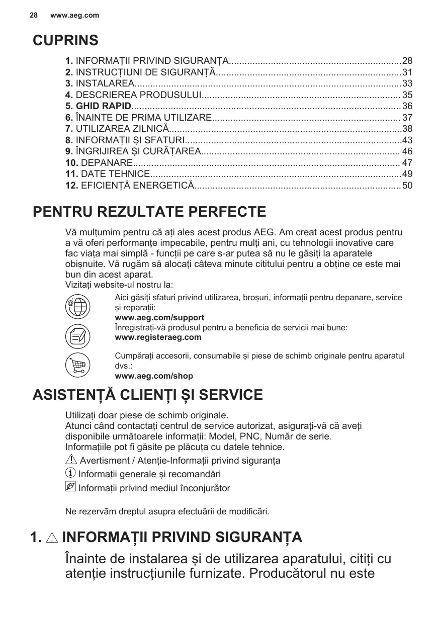 Vă multumim pentru ca ați ale's acest produs AEG. Am creat acest produs pentru a va oferi performante impecabile, pentru multi ani, cu technologii inovative care fac viața mai simplă - functii pe care s-ar putea sa nu le găsiţi la aparatele obișnuite. Vă rugăm să alocăți câteva minute cititului pentru a obtîne ce este mai bun din acest aparat.