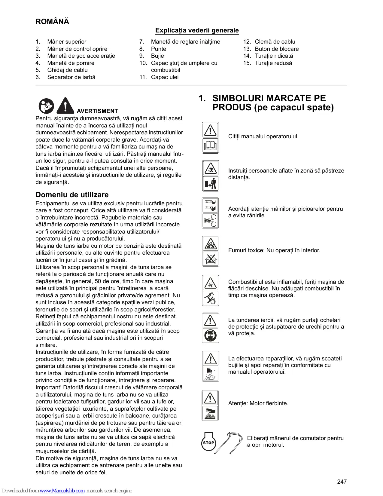 8. - Utilizaţi un cuţit de tăiere ascuţit. - Nu tundeţi iarbă udă. - Setaţi turaţia maximă a motorului. - Deplasaţi-vă doar în spaţiul de lucru. Verificaţi şi/sau înlocuiţi periodic plăcuţele de frână la un atelier de service şi utilizaţi numai piese de schimb originale.