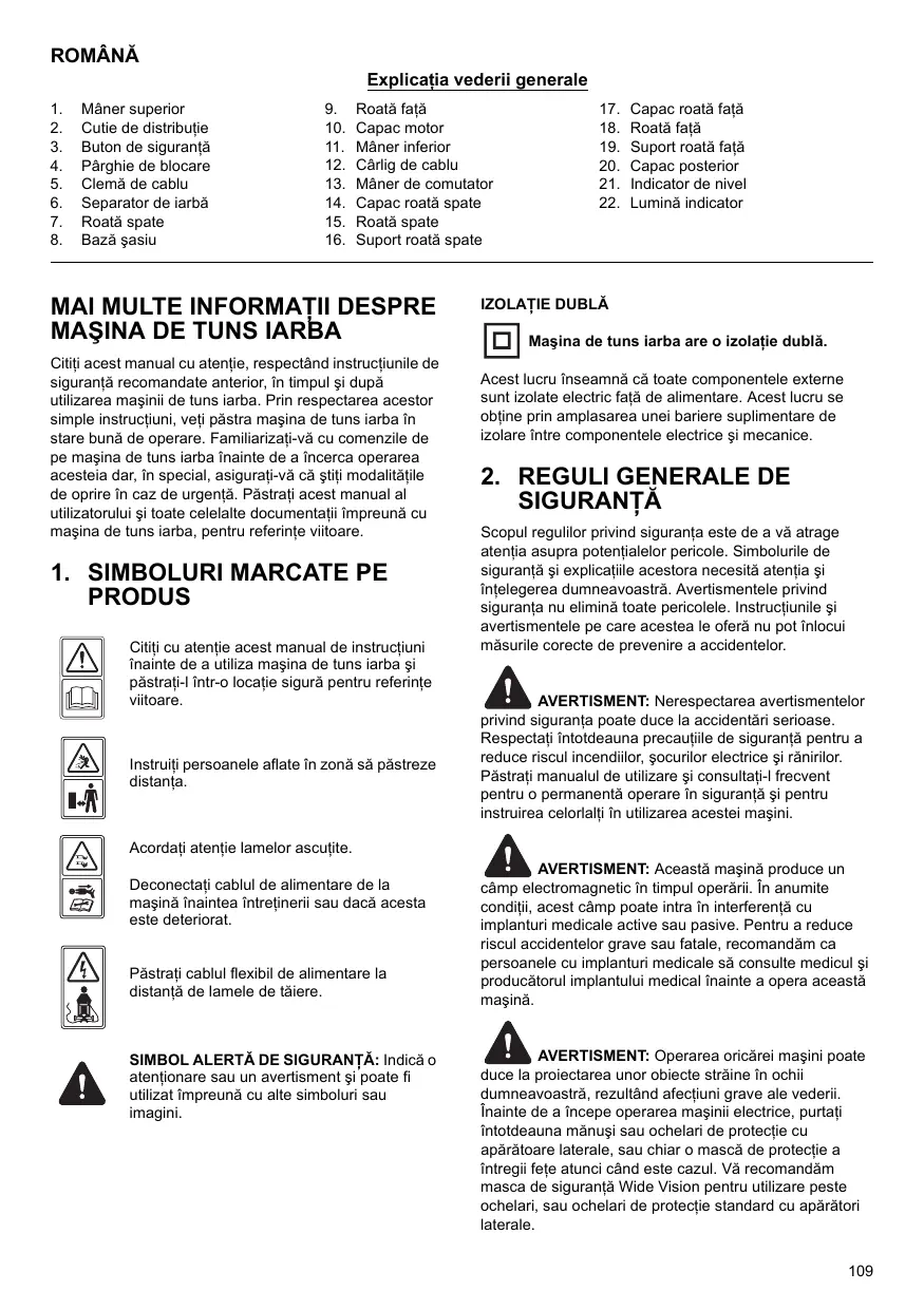 1. SYMBOLES MARQUÉS SUR LE PRODUIT Lisez ce manuel d’instructions attentivement avant d’utiliser la tondeuse et conservez-le dans un endroit sûr pour toute référence future.