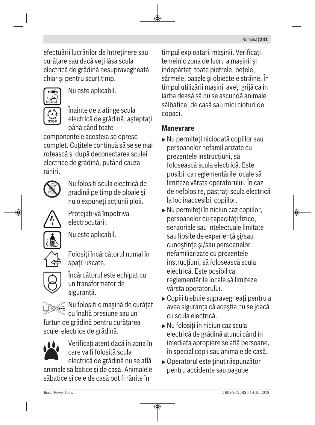 Română Instrucţiuni privind siguranţa Atenție! Citiţi cu grijă următoarele instrucţiuni. Familiarizaţi-vă cu elementele de operare şi utilizarea reglementară a sculei electrice de grădină. Păstraţi la loc sigur instrucţiunile de folosire în vederea unei utilizări ulterioare. Explicarea simbolurilor de pe scula electrică de grădină Indicaţie generală de avertizare a periculozităţii. Citiţi instrucţiunile de folosire. Aveţi grijă ca persoanele aflate în preajmă să nu fie rănite de corpurile străine aruncate. Avertisment: Menţineţi o distanţă sigură faţă de scula electrică de grădină cât timp aceasta lucrează. Atenţie: Nu atingeţi cuţitele care se rotesc. Cuţitele sunt ascuţite. Aveţi grijă să nu vă tăiaţi degetele. Opriţi scula electrică de grădină şi decuplaţi disjunctorul înaintea Bosch Power Tools Română | 241 efectuării lucrărilor de întreţinere sau curăţare sau dacă veţi lăsa scula electrică de grădină nesupravegheată chiar şi pentru scurt timp. Nu este aplicabil. Înainte de a atinge scula electrică de grădină, aşteptaţi până când toate componentele acesteia se opresc complet. Cuţitele continuă să se se mai rotească şi după deconectarea sculei electrice de grădină, putând cauza răniri. Nu folosiţi scula electrică de grădină pe timp de ploaie şi nu o expuneţi acţiunii ploii. Protejaţi-vă împotriva electrocutării. Nu este aplicabil. Folosiţi încărcătorul numai în spaţii uscate. Încărcătorul este echipat cu un transformator de siguranţă. Nu folosiţi o maşină de curăţat cu înaltă presiune sau un furtun de grădină pentru curăţarea sculei electrice de grădină. Verificați atent dacă în zona în care va fi folosită scula electrică de grădină nu se află animale sălbatice și de casă. Animalele săbatice și cele de casă pot fi rănite în Bosch Power Tools timpul exploatării mașinii. Verificați temeinic zona de lucru a mașinii și îndepărtați toate pietrele, bețele, sârmele, oasele și obiectele străine. În timpul utilizării mașinii aveți grijă ca în iarba deasă să nu se ascundă animale sălbatice, de casă sau mici cioturi de copaci. Manevrare u Nu permiteţi niciodată copiilor sau persoanelor nefamiliarizate cu prezentele instrucţiuni, să folosească scula electrică. Este posibil ca reglementările locale să limiteze vârsta operatorului. În caz de nefolosire, păstraţi scula electrică la loc inaccesibil copiilor. u Nu permiteţi în niciun caz copiilor, persoanelor cu capacităţi fizice, senzoriale sau intelectuale limitate sau lipsite de experienţă şi/sau cunoştinţe şi/sau persoanelor nefamiliarizate cu prezentele instrucţiuni, să folosească scula electrică. Este posibil ca reglementările locale să limiteze vârsta operatorului. u Copiii trebuie supravegheaţi pentru a avea siguranţa că aceştia nu se joacă cu scula electrică. u Nu folosiţi în niciun caz scula electrică de grădină atunci când în imediata apropiere se află persoane, în special copii sau animale de casă. u Operatorul este ţinut răspunzător pentru accidente sau pagube 1 609 92A 5BS | (14.10.2019) 242 | Română provocate altor oameni sau bunurilor acestora. u Nu purtați pantofi sau sandale deschise din cauciuc atunci când folosiți scula electrică. Purtaţi încălţăminte solidă şi pantaloni lungi. u Inspectaţi atent suprafaţa pe care urmează să o lucraţi şi îndepărtaţi cu grijă pietrele, beţele, sârmele, oasele şi alte corpuri străine. u Înainte de utilizare verificaţi vizual întotdeauna dacă, cuţitele, şuruburile cuţitelor cât şi blocul de cuţite nu sunt uzate sau deteriorate. Pentru evitarea dezechilibrelor, înlocuiţi întotdeauna întregul set de cuţite şi şuruburi de cuţite uzate sau deteriorate. u Cosiţi numai la lumina zilei sau la lumină artificială bună. u În condiţii meteo nefavorabile în special în caz de furtună, nu lucraţi cu maşina de tuns iarba. u Pe cât posibil nu folosiţi scula electrică de grădină la tunderea ierbii ude. u Păşiţi întotdeauna încet, nu alergaţi niciodată repede. u Nu folosiţi în niciun caz scula electrică de grădină dacă aceasta prezintă dispozitive de protecţie, capace defecte sau echipamente de siguranţă care lipsesc, ca de exemplu bara de protecţie sau coşul colector de iarbă. 1 609 92A 5BS | (14.10.2019) Pentru propria dumneavoastră protecţie, vă recomandăm să purtaţi căşti antizgomot. u Nu folosiți scula electrică dacă sunteți obosiți sau bolnavi sau vă aflați sub influența alcoolului, a drogurilor sau a medicamentelor. u Cosirea ierbii pe taluzuri poate fi periculoasă: – Nu cosiţi în pantă foarte abruptă. – Fiţi întotdeauna atenţi, astfel încât să păşiţi în siguranţă pe suprafeţele înclinate sau pe iarba udă. – Pe suprafeţele înclinate cosiţi întotdeauna transversal şi niciodată în sus şi în jos. – La schimbarea direcţiei în pante fiţi extrem de precauţi. u Fiţi extrem de precauţi atunci când mergeţi înapoi cu scula electrică de grădină sau o trageţi spre dumneavoastră. u În timpul cosirii împingeţi scula electrică de grădină întotdeauna spre înainte şi nu o trageţi niciodată în direcţia corpului dumneavoastră. u Cuţitele trebuie să se afle în repaus, atunci când sunteţi nevoiţi să răsturnaţi scula electrică de grădină în vederea transportului, când traversaţi suprafeţe neplantate cu iarbă şi când transportaţi scula electrică spre şi de la sectorul de cosit. u Nu înclinaţi scula electrică de grădină la demarare sau în momentul pornirii motorului.