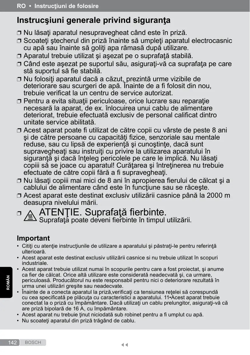 stă suportul să ie stabilă. Nu folosiţi aparatul dacă a căzut, prezintă urme vizibile de deteriorare sau scurgeri de apă. Înainte de a i folosit din nou, trebuie veriicat la un centru de service autorizat. Pentru a evita situaţii periculoase, orice lucrare sau reparaţie necesară la aparat, de ex. înlocuirea unui cablu de alimentare deteriorat, trebuie efectuată exclusiv de personal caliicat dintro unitate service abilitată. Acest aparat poate i utilizat de către copii cu vârste de peste 8 ani şi de către persoane cu capacităţi izice, senzoriale sau mentale reduse, sau cu lipsă de experienţă şi cunoştinţe, dacă sunt supravegheaţi sau instruiţi cu privire la utilizarea aparatului în siguranţă şi dacă înţeleg pericolele pe care le implică. Nu lăsaţi copiii să se joace cu aparatul! Curăţarea şi întreţinerea nu trebuie efectuate de către copii fără a i supravegheaţi. Nu lăsaţi copiii mai mici de 8 ani în apropierea ierului de călcat şi a cablului de alimentare când este în funcţiune sau se răceşte. Acest aparat este destinat exclusiv utilizării casnice până la 2000 m deasupra nivelului mării.