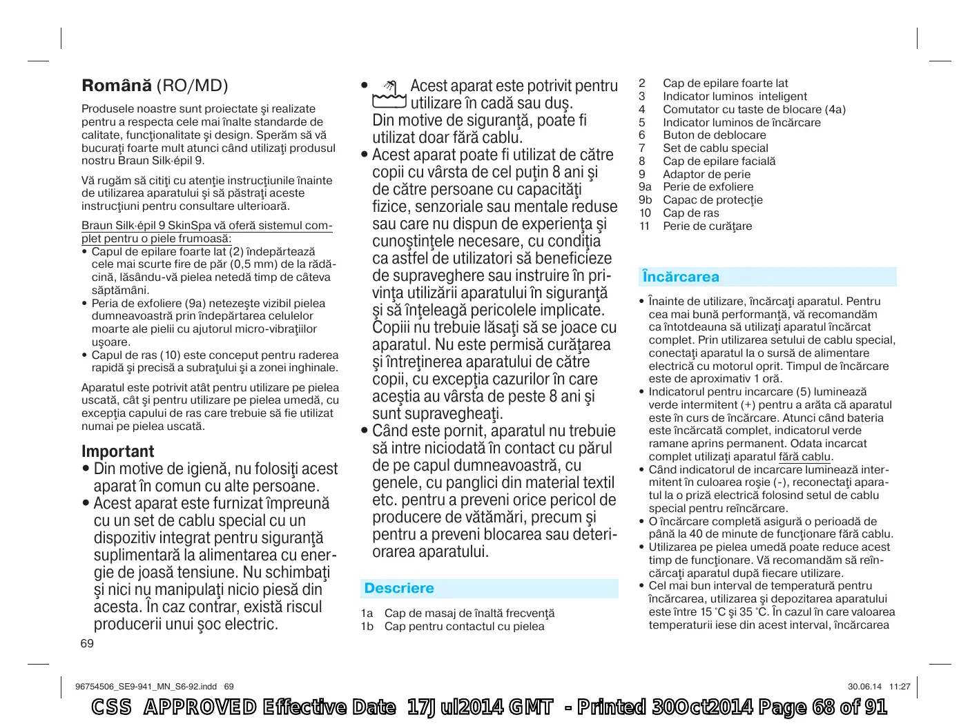 CSS APPROVED Effective Date 17Jul2014 GMT - Printed 30Oct2014 Page 67 of 91 Română (RO/MD) Produsele noastre sunt proiectate şi realizate pentru a respecta cele mai înalte standarde de calitate, funcţionalitate şi design. Sperăm să vă bucuraţi foarte mult atunci când utilizaţi produsul nostru Braun Silk·épil 9. Vă rugăm să citiţi cu atenţie instrucţiunile înainte de utilizarea aparatului şi să păstraţi aceste instrucţiuni pentru consultare ulterioară. Braun Silk·épil 9 SkinSpa vă oferă sistemul complet pentru o piele frumoasă: