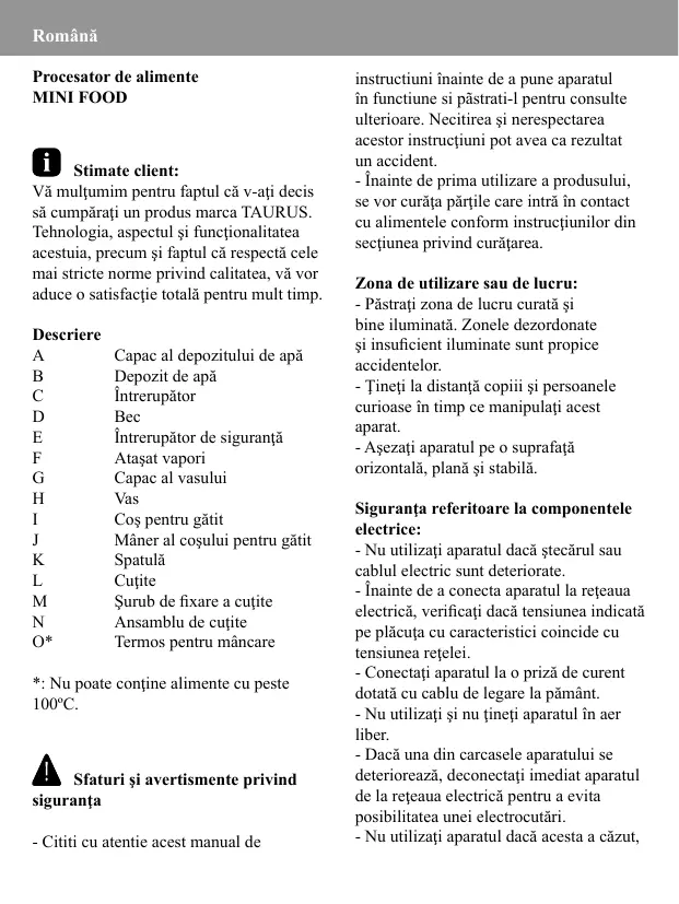 MANUAL DE UTILIZARE ROBOT DE CUISINE A VAPEUR 925004 TAURUS