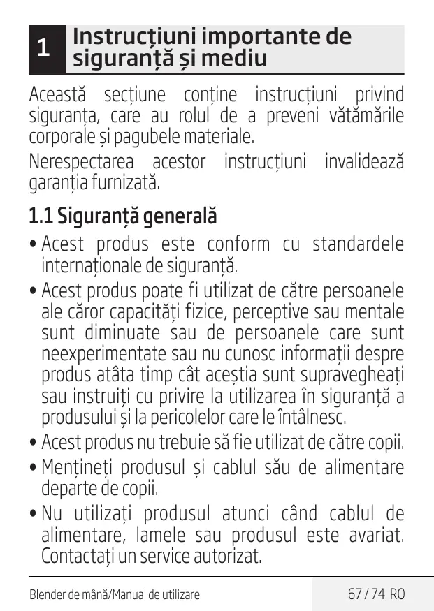 66 / 74 RO Blender de mână/Manual de utilizare importante de 1 Instrucţiuni siguranţă şi mediu Această secţiune conţine instrucţiuni privind siguranţa, care au rolul de a preveni vătămările corporale şi pagubele materiale. Nerespectarea acestor instrucţiuni invalidează garanţia furnizată.