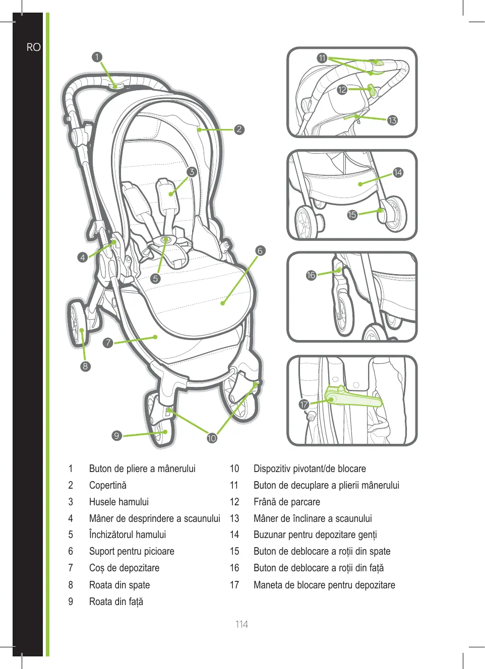 RO RO CADRUL 1 Scoateți cadrul căruciorului din cutie și puneți roțile deoparte. Deblocați căruciorul trăgând de maneta de blocare pentru depozitare. 2 Ridicați partea din față a cadrului căruciorului îndepărtând-o de partea din spate a cadrului. 3 Ridicaţi partea superioară a cadrului îndepărtând-o de partea inferioară a cadrului. 4 Rotiţi mânerul în sus. Căruciorul se va fixa pe poziție și dvs veți auzi un clic. AVERTISMENT: Înainte de utilizare, asigurați-vă că toate dispozitivele de blocare sunt activate. AVERTISMENT: Piesele mobile pot provoca răniri atunci când se pliază și depliază căruciorul. Copiii trebuie să stea deoparte atunci când se pliază și depliază căruciorul. ROATA DIN FAȚĂ 5 Instalare • Așezați căruciorul pe spate astfel încât mânerul să se sprijine pe podea. • Atașați roata din față glisând-o în suportul de fixare a roții din față până când auziți un clic. Trageți ușor de roată pentru a vă asigura că aceasta este atașată corespunzător. 6 Demontare • Țineți apăsat pe butonul de deblocare a roții din față și glisați ușor roata din față pentru a o scoate din suportul de fixare. FUNCȚIA DE PIVOTARE 7 Împingeţi butonul de blocare a dispozitivului pivotant în sus pentru a bloca roata din faţă în poziţie fixă. 8 Apăsaţi butonul de blocare a dispozitivului pivotant în jos pentru a permite ansamblului roţii din faţă să pivoteze. AVERTISMENT: Când așezați sau scoateți copilul din cărucior, blocați roata din față în poziție fixă. Deși roata din față se fixează pe poziție, căruciorul nu este destinat a fi utilizat pentru jogging sau exerciții fizice.